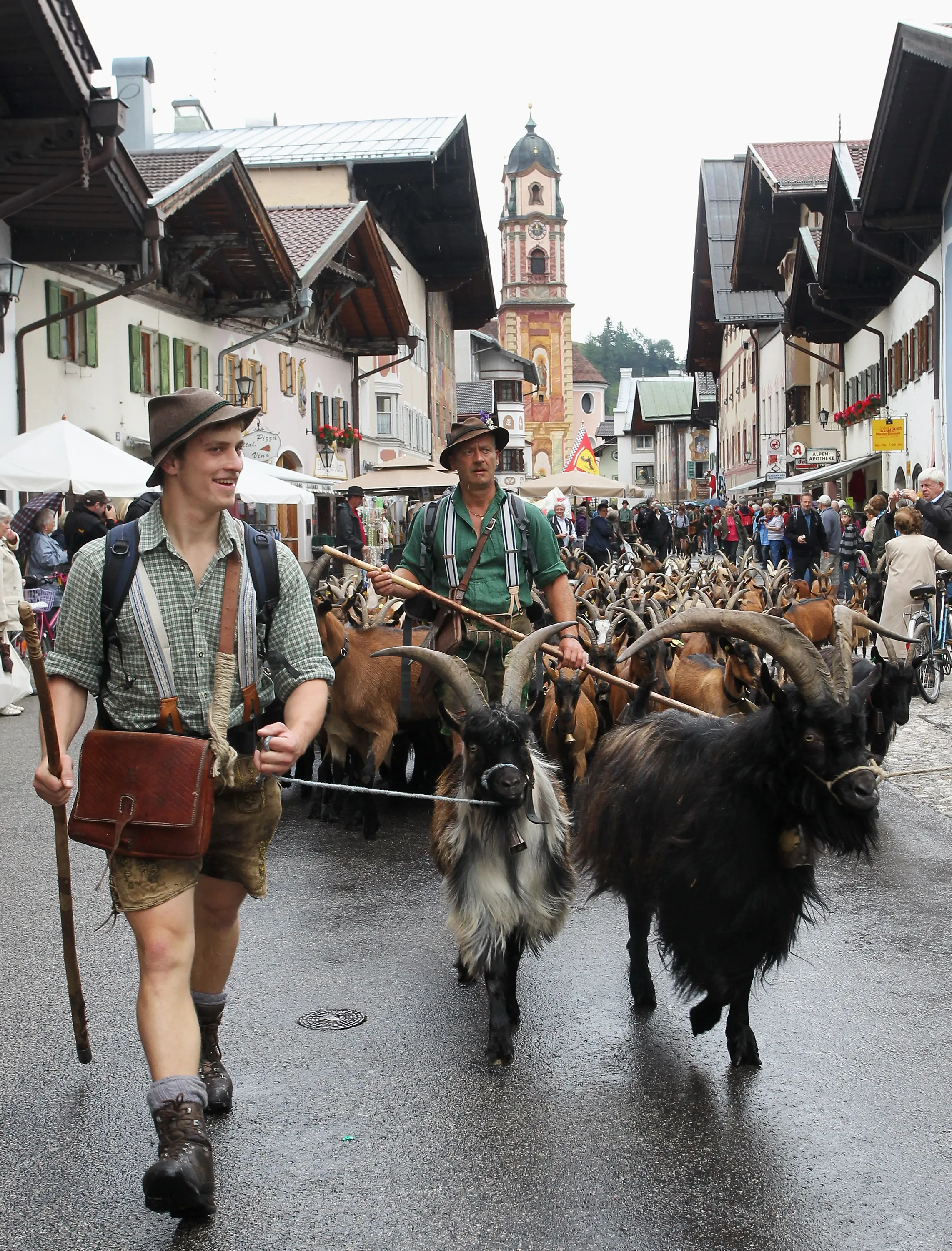 MUNICH, GERMANY - SEPTEMBER 11: A herder dressed in traditional Bavarian clothes drives goats down the Alps at the Ferchensee lake on September 4, 2010 near Mittenwald, Germany. Every year cows, sheep and goats are driven down the mountains in September after they spent about four months on the grazing lands in the Bavarian mountains. (Photo by Alexandra Beier/Bongarts/Getty Images) MITTENWALD, GERMANY - SEPTEMBER 04: A man and a woman watch goats during a goat drive down the Alps on September 4, 2010 in Mittenwald, Germany. Every year cows, sheep and goats are driven down the mountains in September after they spent about four months on the grazing lands in the Bavarian mountains. (Photo by Alexandra Beier/Getty Images)