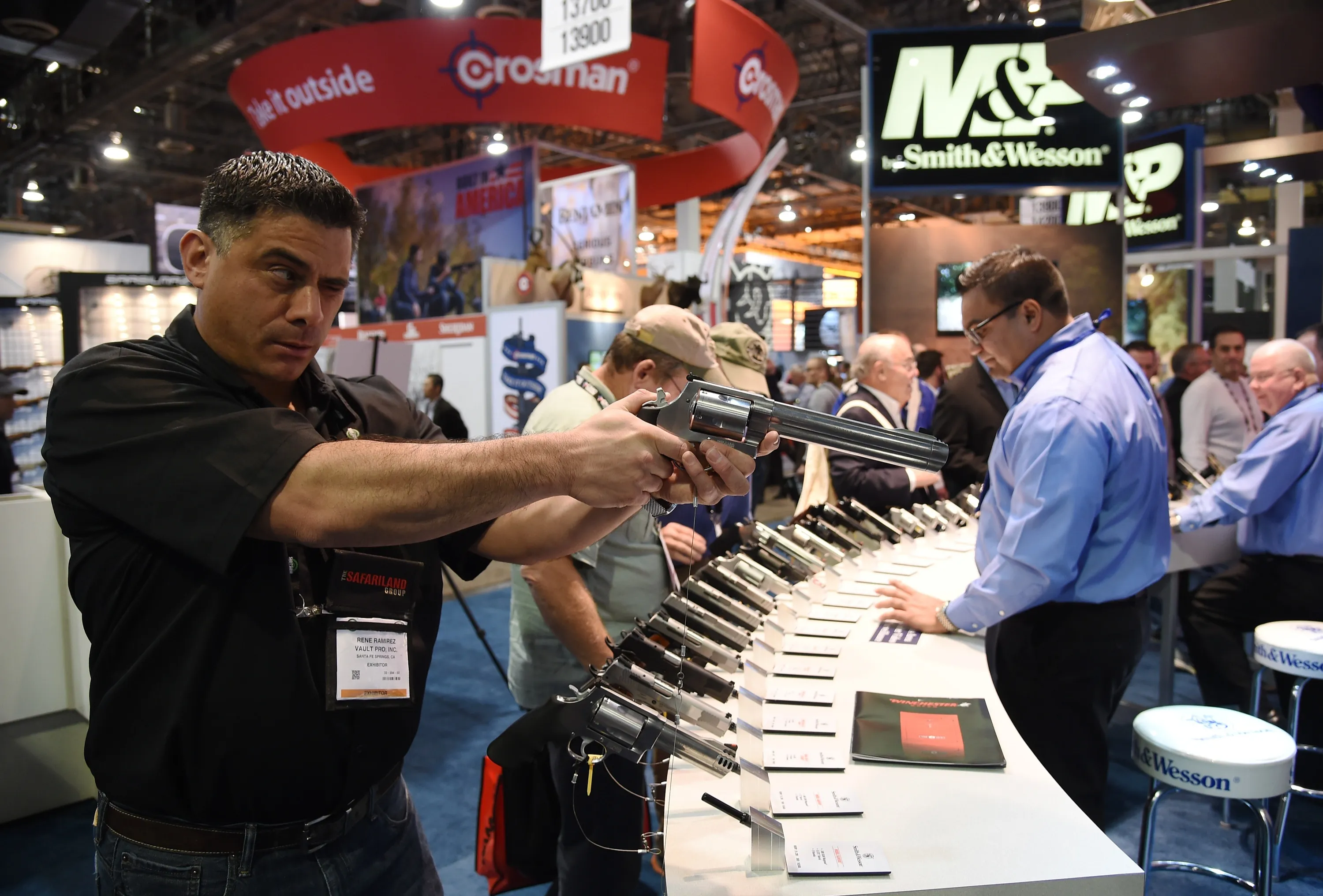 Rene Ramirez checks out a model S&W500 handgun at the Smith & Wesson booth during the 2016 National Shooting Sports Foundation's Shooting, Hunting, Outdoor Trade (SHOT) Show at the Sands Expo and Convention Center on January 19, 2016 in Las Vegas, Nevada. (Photo by Ethan Miller/Getty Images)
