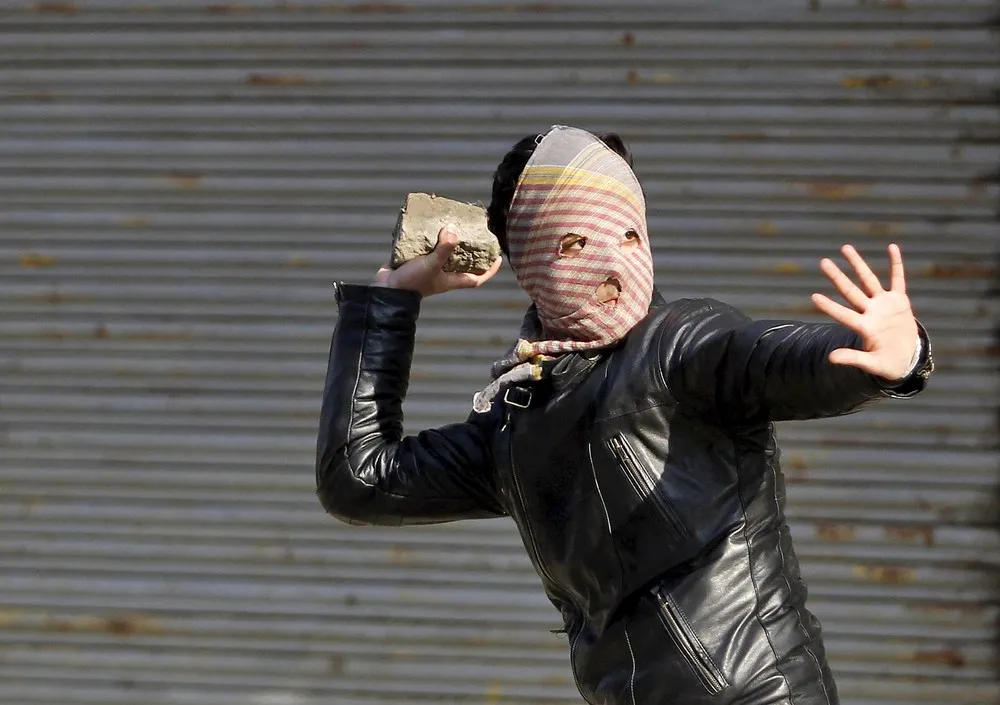 A Kashmiri Muslim demonstrator throws a stone towards Indian police (unseen) during a protest in Srinagar January 21, 2016. Clashes between Indian police and Kashmir Muslim demonstrators broke out on Thursday after a protest which was organised by the Jammu Kashmir Liberation Front (JKLF), a Kashmiri separatist party, to mark the anniversary of the killings of at around 50 people allegedly by Indian security forces during a protest on January 21, 1990, demonstrators said. (Photo by Danish Ismail/Reuters)