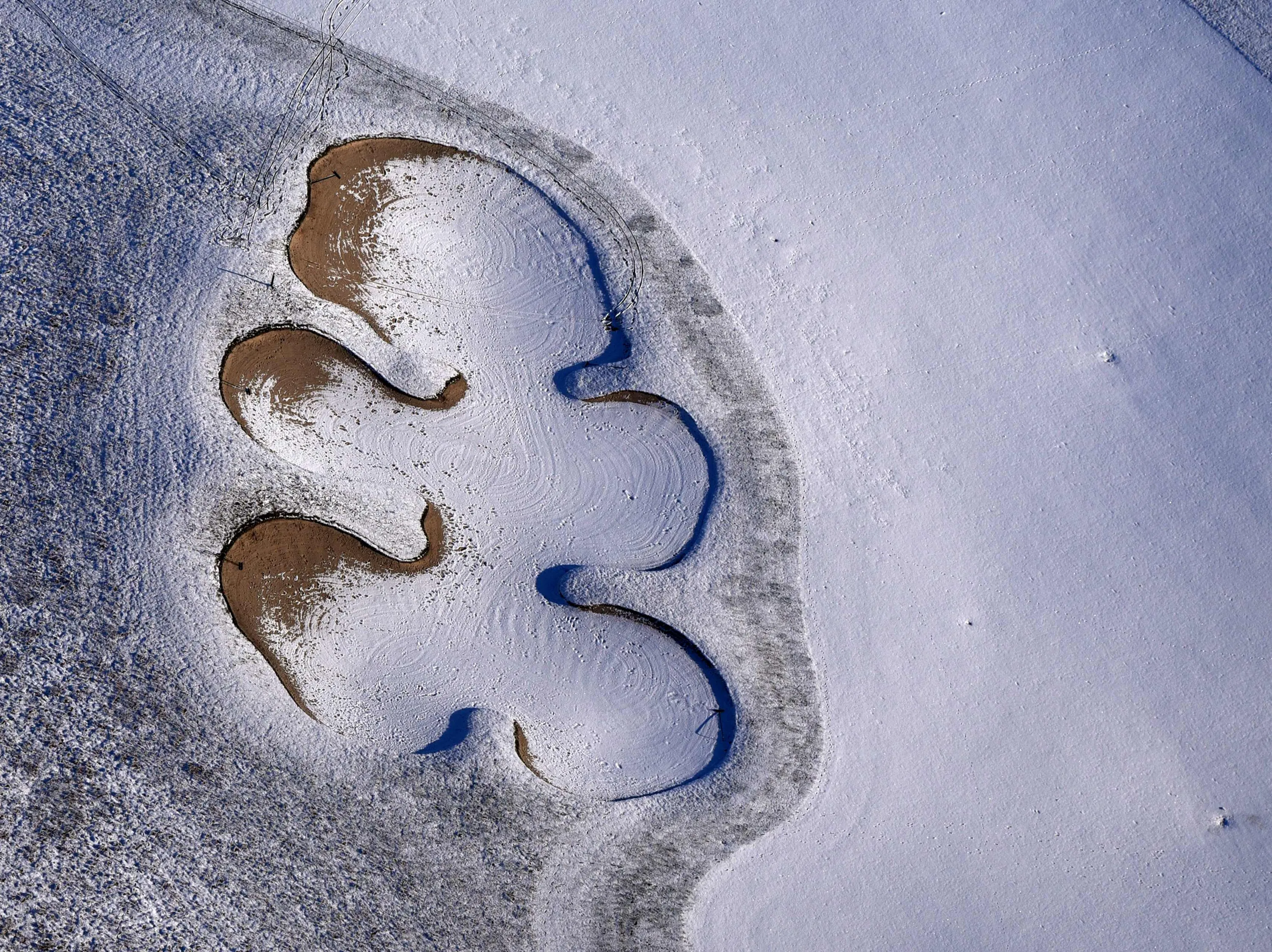 Aerial view taken on January 19, 2016 shows the sand bunker of a golf course covered in snow near Michendorf, northeastern Germany. (Photo by Ralf Hirschberger/AFP Photo/DPA)