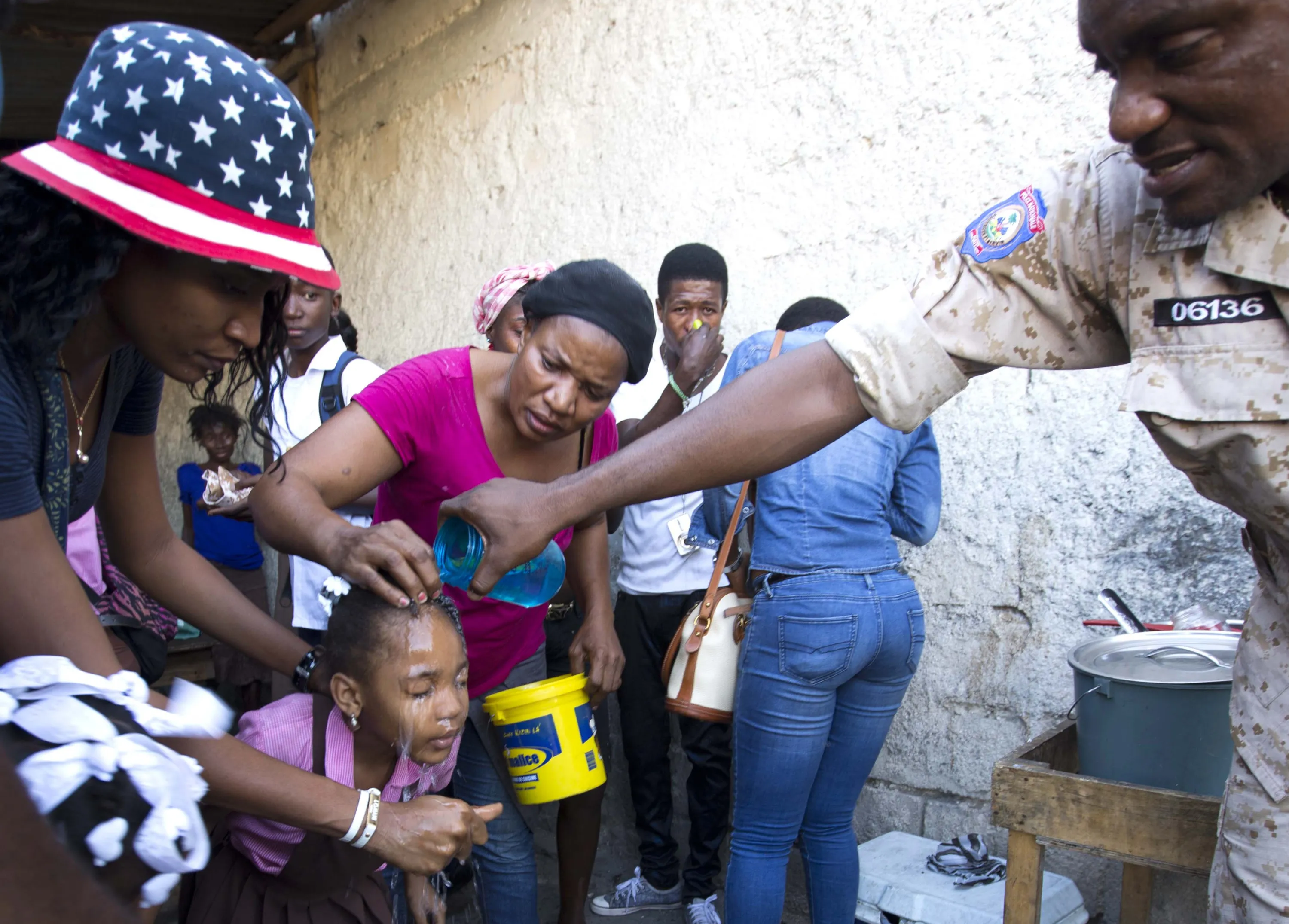 A police officer helps a child that was overcome by teargas during a protest against President Michel Martelly's government to demand the cancellation of the uaryJan. 24, elections, in Port-au-Prince, Haiti, Tuesday, Jan 19, 2016. Disputed election results have brought paralyzing street protests and many broad accusations of electoral fraud from civil society and opposition groups. (Photo by Dieu Nalio Chery/AP Photo)