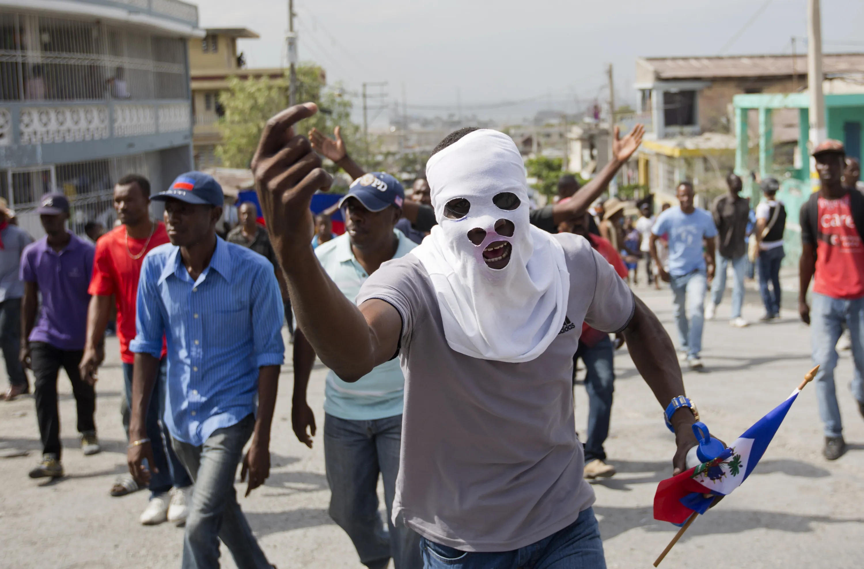 A masked demosntrator chants anti-government slogans during a street protest after it was announced that the runoff Jan. 24, presidential election had been postponed, in Port-au-Prince, Haiti, Friday, January 22, 2016. (Photo by Dieu Nalio Chery/AP Photo)