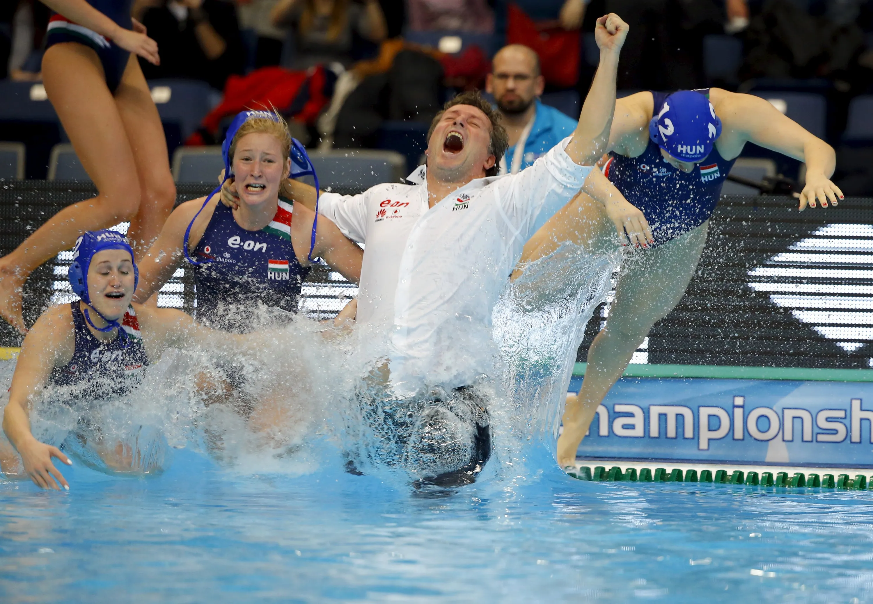 Hungary's coach Attila Biro jumps in the pool as he celebrates his team's victory over Netherlands during the women's European Water Polo Championship gold medallion match in Belgrade, Serbia January 22, 2016. (Photo by Laszlo Balogh/Reuters)