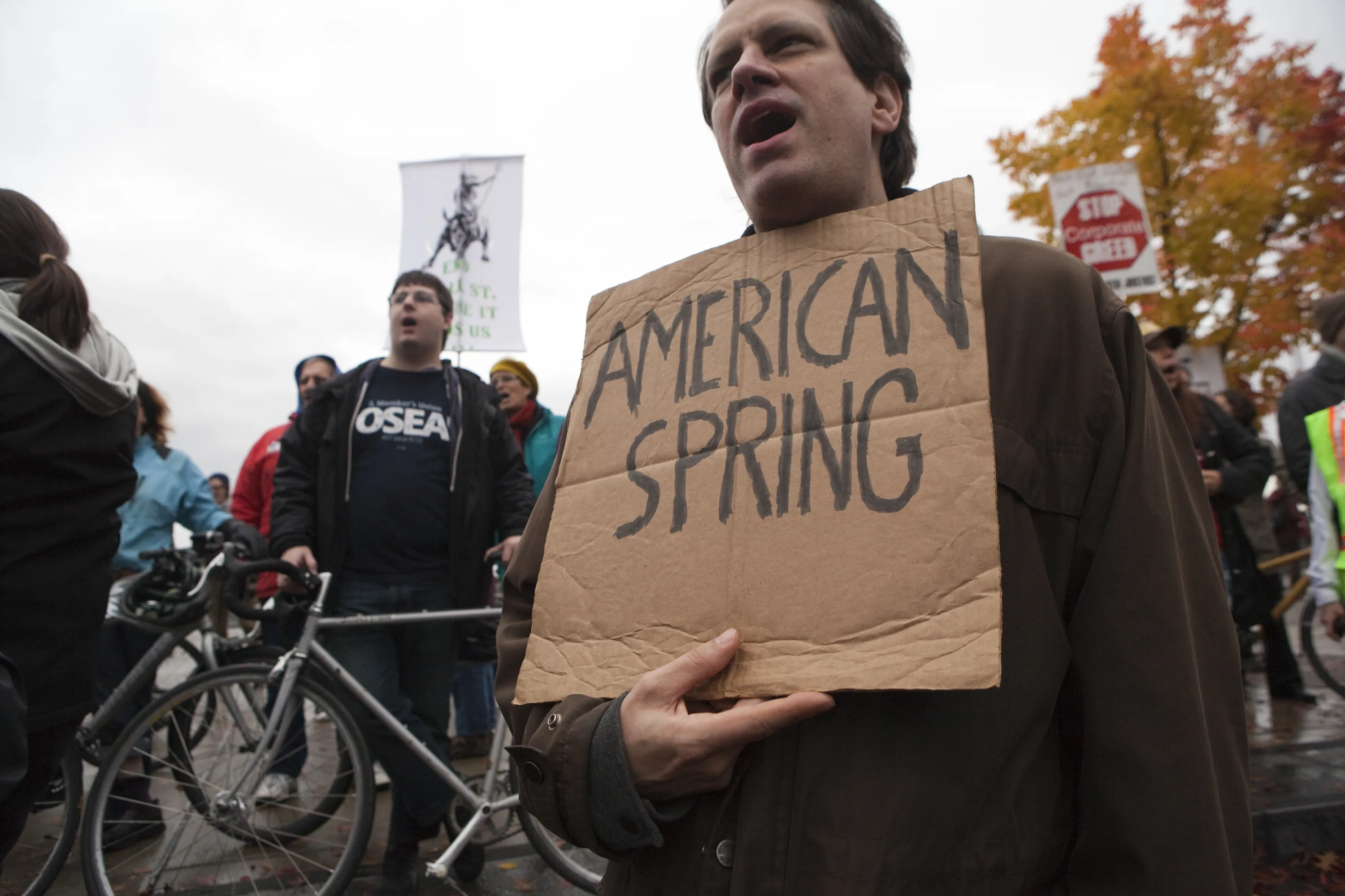 PORTLAND, OR - NOVEMBER 17: A man holds a sign reading 'American Spring' as he participates in a rally November 17, 2011 in Portland, Oregon. The Occupy Portland movement joined the nationwide N17 protests today, targeting downtown banks. (Photo by Natalie Behring/Getty Images)