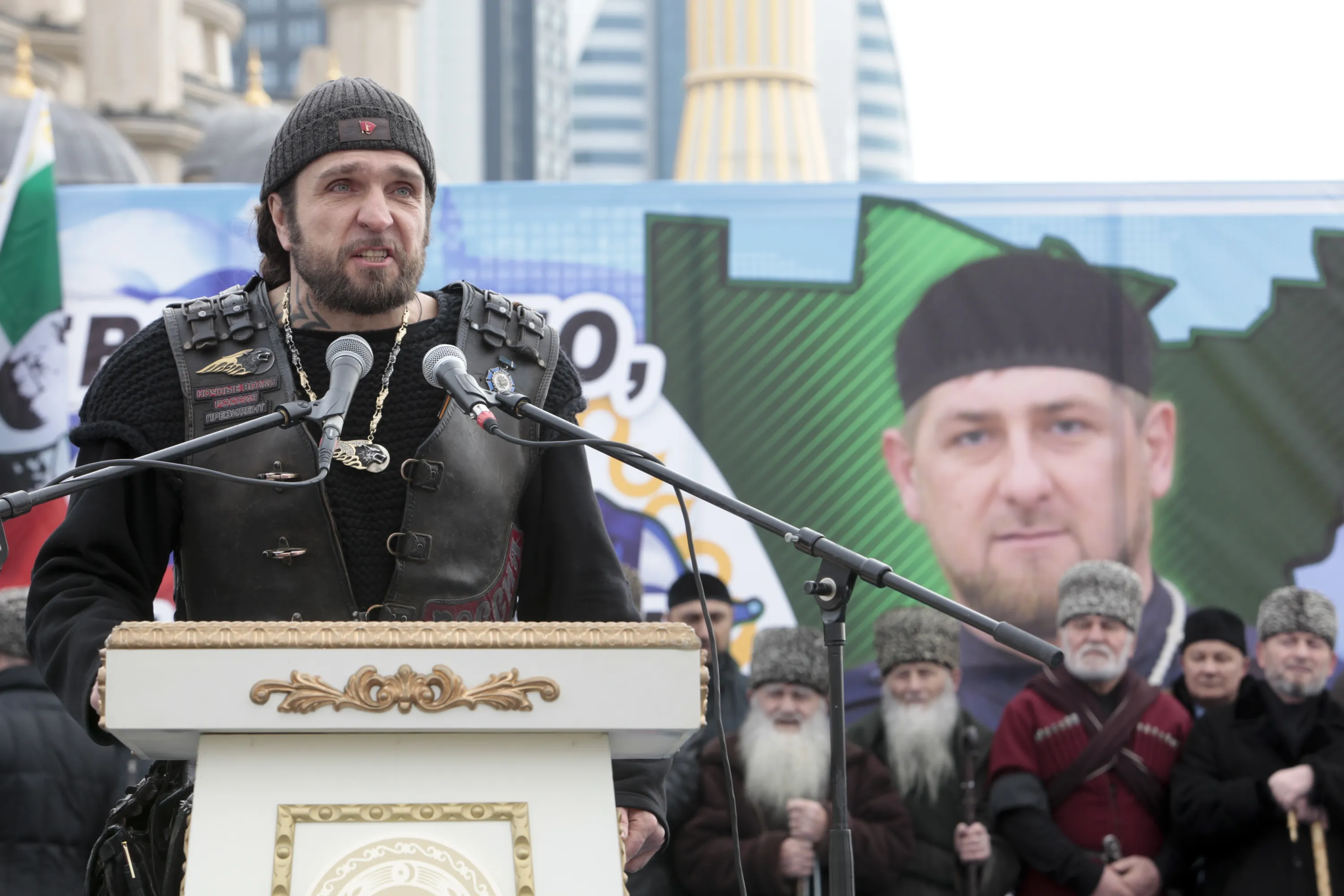 Russian biker group leader of Nochniye Volki (the Night Wolves), Alexander Zaldostanov, also known as Khirurg (the Surgeon) speaks to the crowd during a massive rally in Grozny, Russia, Friday, January 22, 2016. Tens of thousands of people have rallied in the capital of Russia's Chechnya Republic in support of strongman leader Ramzan Kadyrov and Russian President Vladimir Putin. (Photo by Musa Sadulayev/AP Photo)