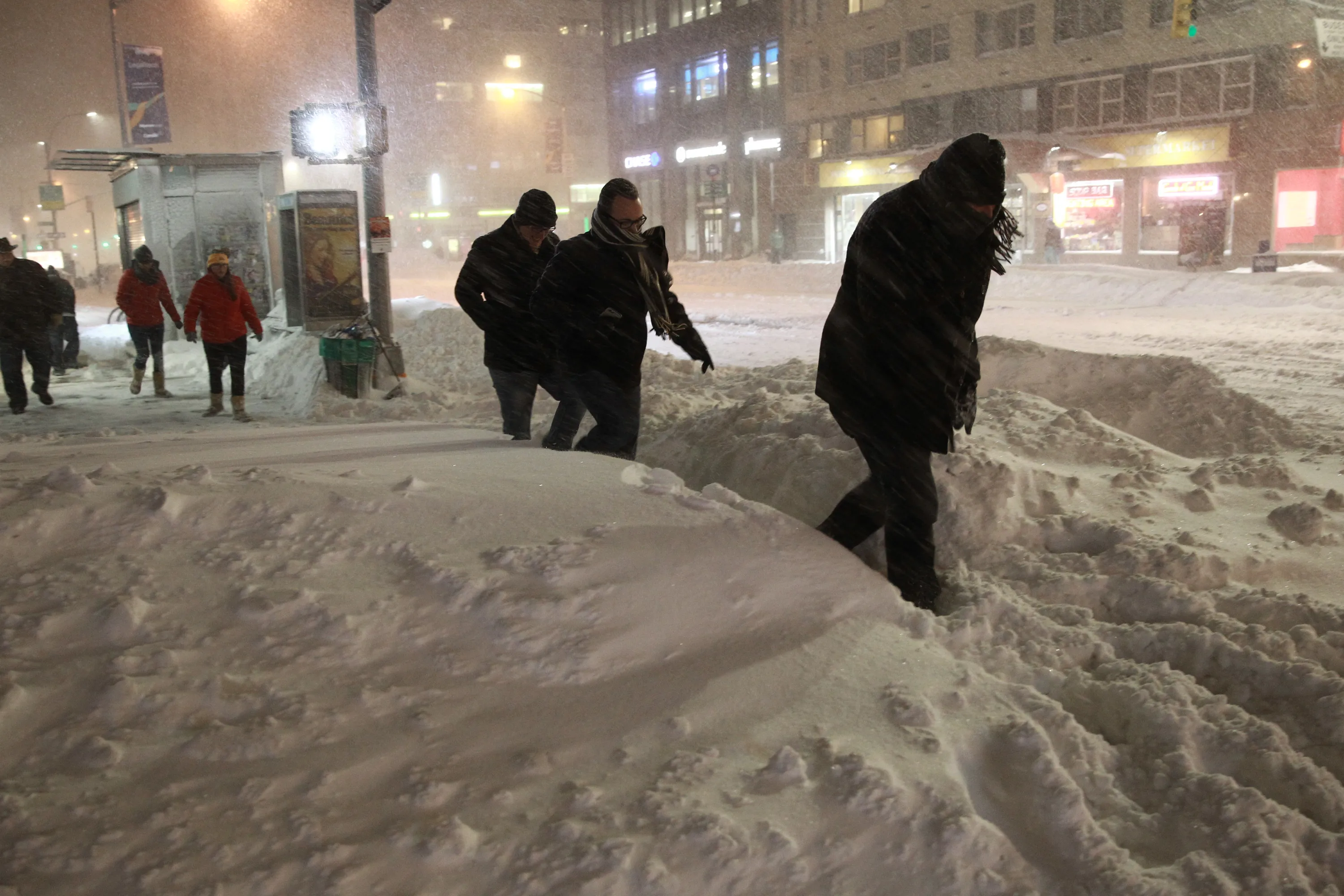 Pedestrians make their way through heavy snow and deep embankments in midtown Manhattan in New York City, Saturday, January 23, 2016. A blizzard with hurricane-force winds brought much of the East Coast to a standstill Saturday. (Photo by Gordon Donovan/Yahoo News)