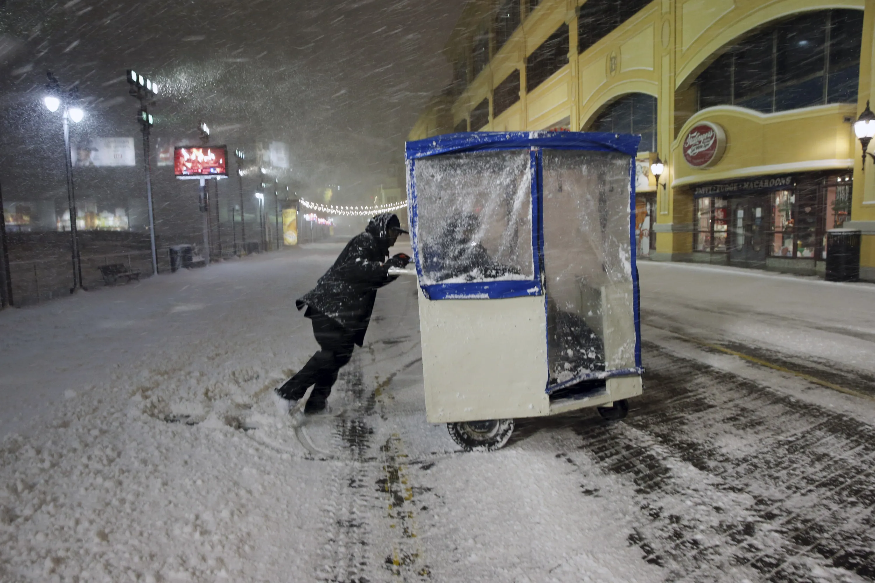 A man maneuvers his Push cart with passengers during a snowstorm early Saturday, January 23, 2016, on the Atlantic City Boardwalk. Most of the state was facing a blizzard warning from Friday evening until Sunday that called for up to 24 inches of snow, with the deepest accumulations in the central part of the state. (Photo by Mel Evans/AP Photo)