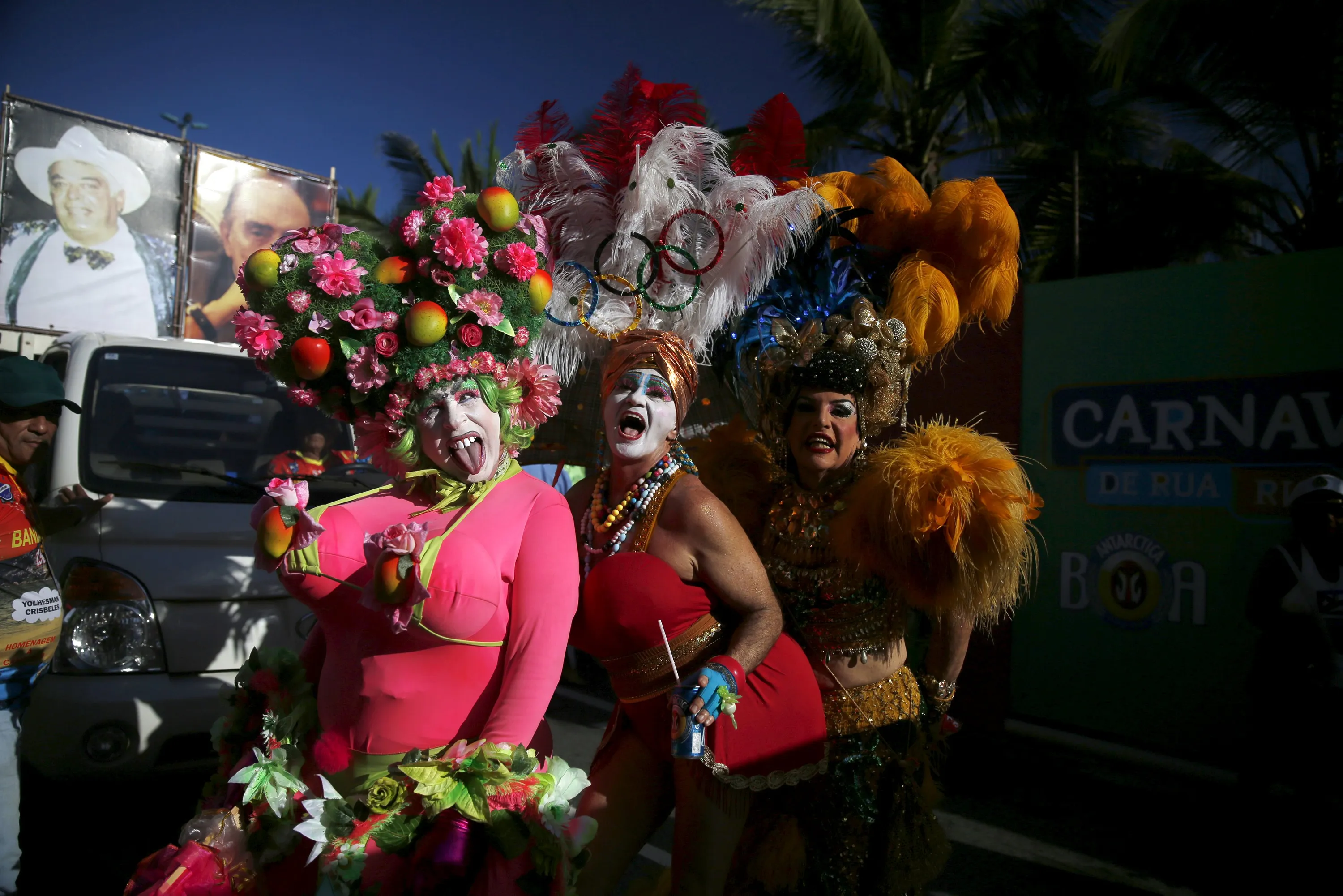 Revellers pose for photos as they take part in the annual block party known as the “Banda de Ipanema” during pre-carnival festivities on Ipanema beach in Rio de Janeiro, Brazil, January 23, 2016. (Photo by Pilar Olivares/Reuters)
