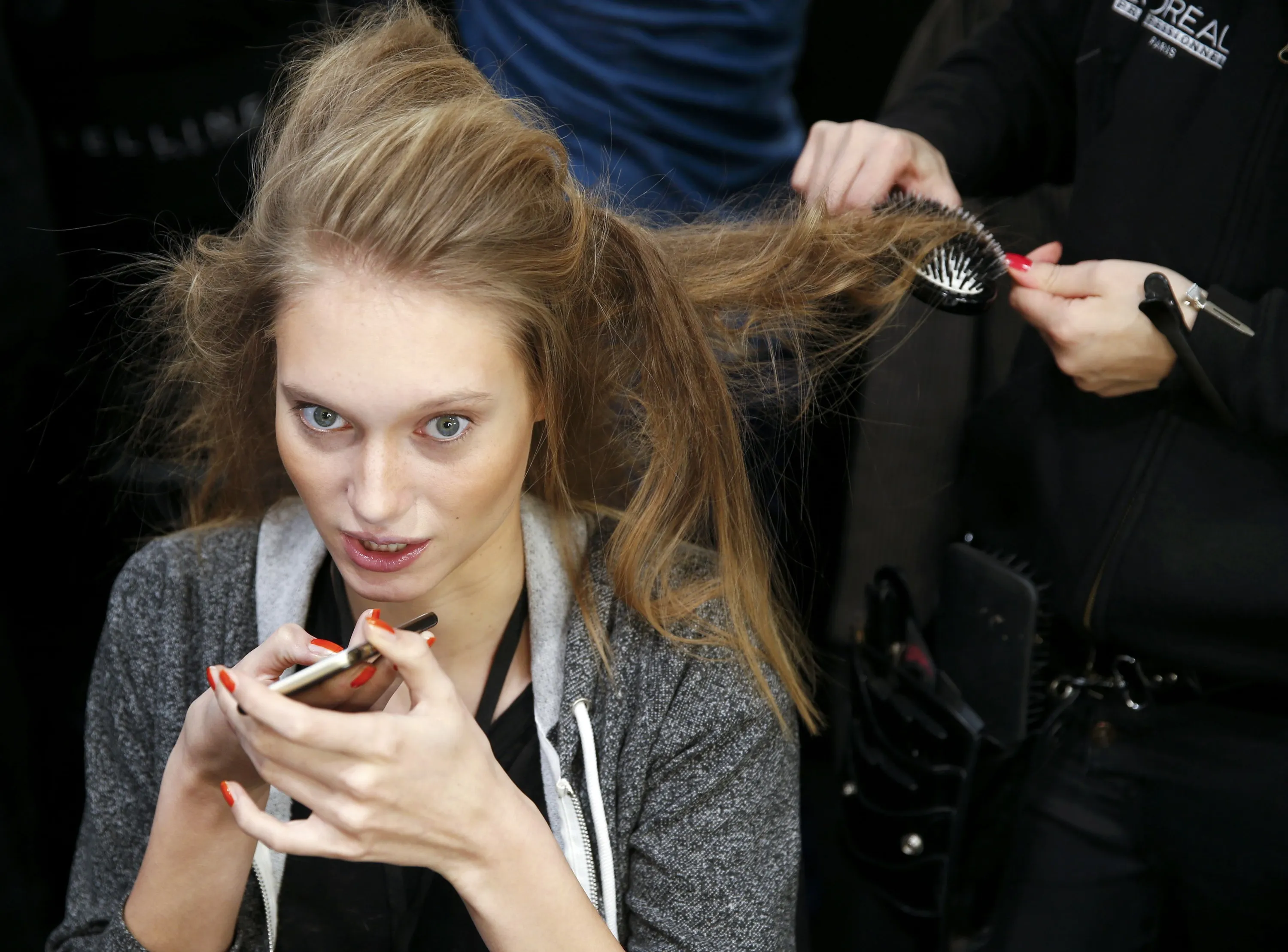 A model gets her hair done backstage for the presentation of the fashion label Anja Gockel at the Berlin Fashion Week Autumn/Winter 2016 in Berlin, Germany, January 20, 2016. (Photo by Fabrizio Bensch/Reuters)