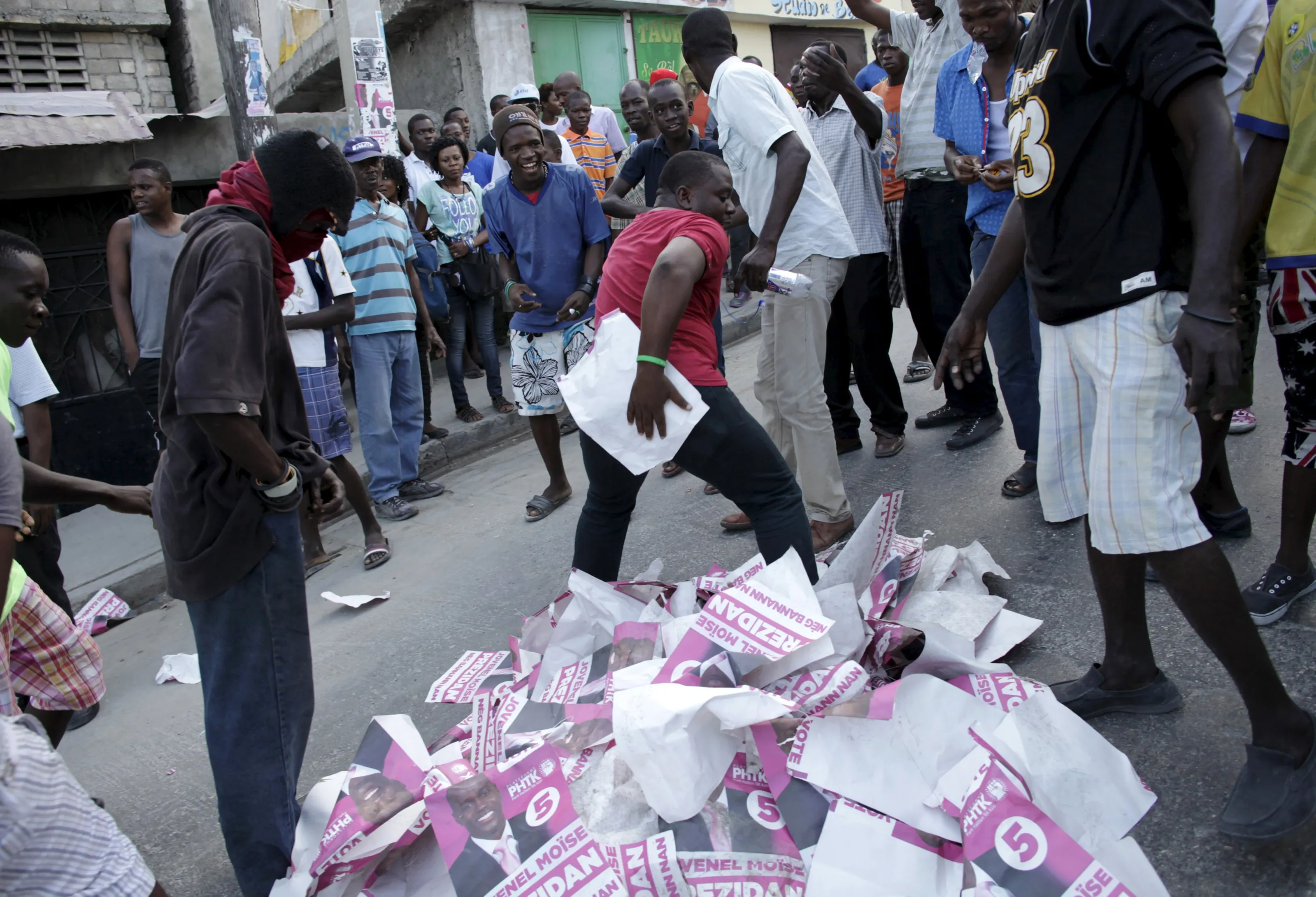 A protester (C) rubs his backside with an electoral poster of presidential candidate Jovenel Moise during a demonstration rallying for the resignation of President Michel Martelly in Port-au-Prince, Haiti, January 23, 2016. Haiti braced for more demonstrations against outgoing President Michel Martelly on Saturday even after authorities buckled to pressure and canceled a presidential election the opposition said was riddled with fraud. (Photo by Andres Martinez Casares/Reuters)