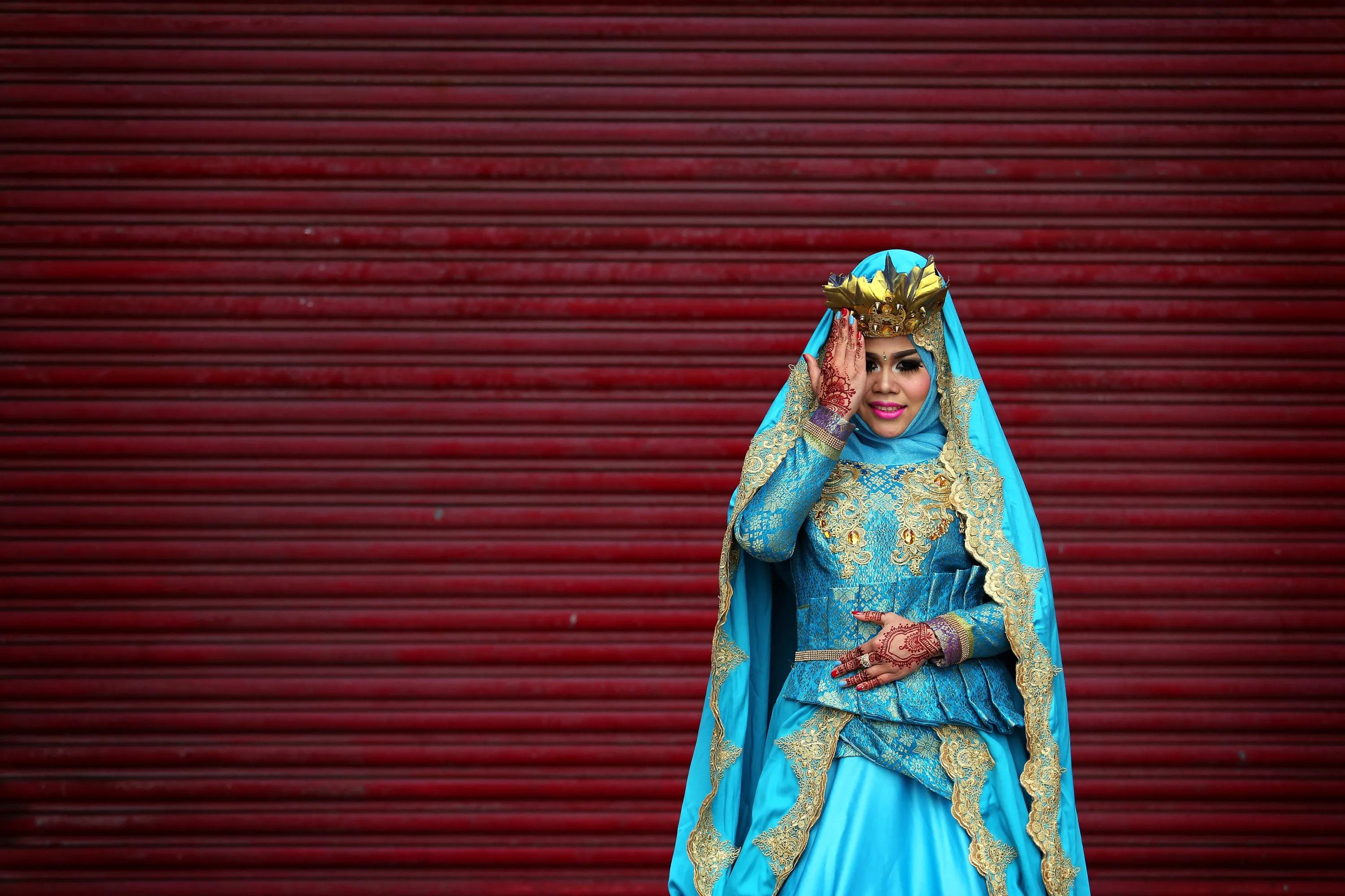 A women wearing Indonesian dress takes part in a fashion shoot in the Tsim Sha Tsui district of Hong Kong on January 24, 2016. Indonesian and Filipino women were taking part in a fashion show on one of the cruise ships docked at Ocean Terminal in Hong Kong. (Photo by Isaac Lawrence/AFP Photo)