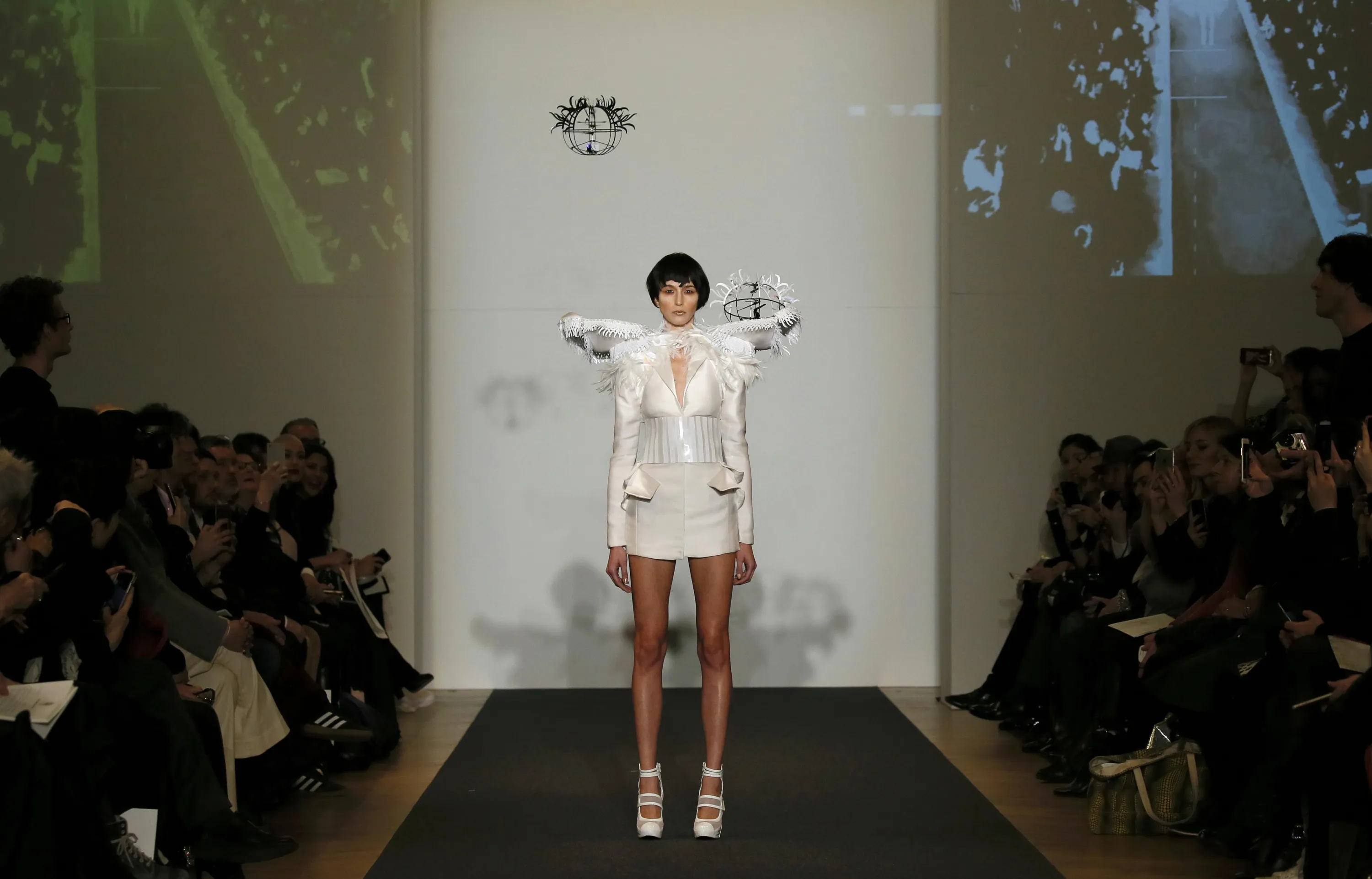 Drones hover as a model presents a creation by Bulgarian designers Livia Stoianova and Yassen Samouilov as part of their Haute Couture Spring/Summer 2016 fashion show for fashion house On Aura Tout Vu in Paris January 25, 2016. (Photo by Gonzalo Fuentes/Reuters)