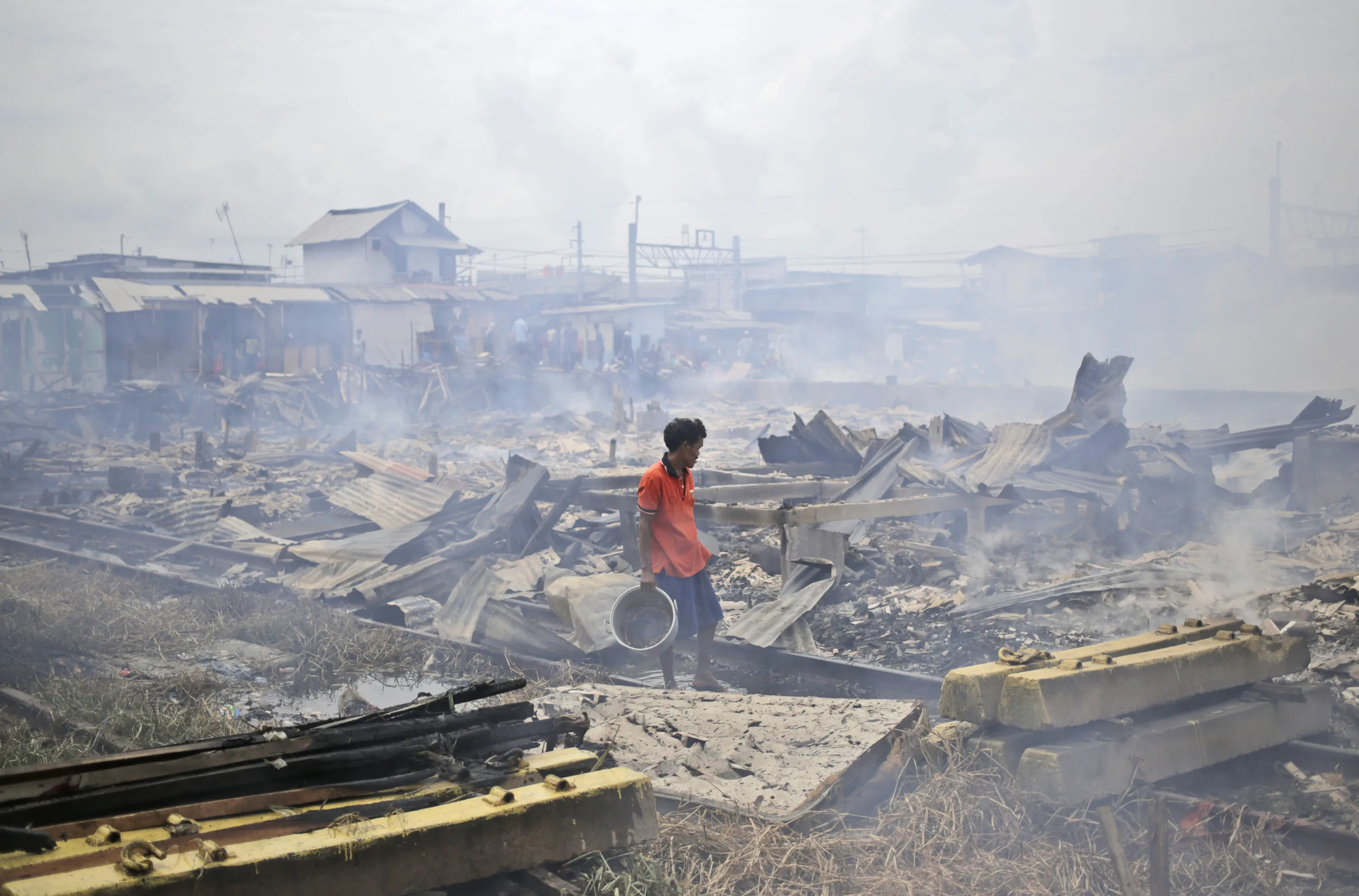 A man stands amid the rubble of houses burned down by a fire that razed through a slum in Jakarta, Indonesia, Tuesday, January 26, 2016. Fire is a frequent occurrence in Jakarta's slums which often have jury-rigged electrical connections and little or no safety features. (Photo by Dita Alangkara/AP Photo)