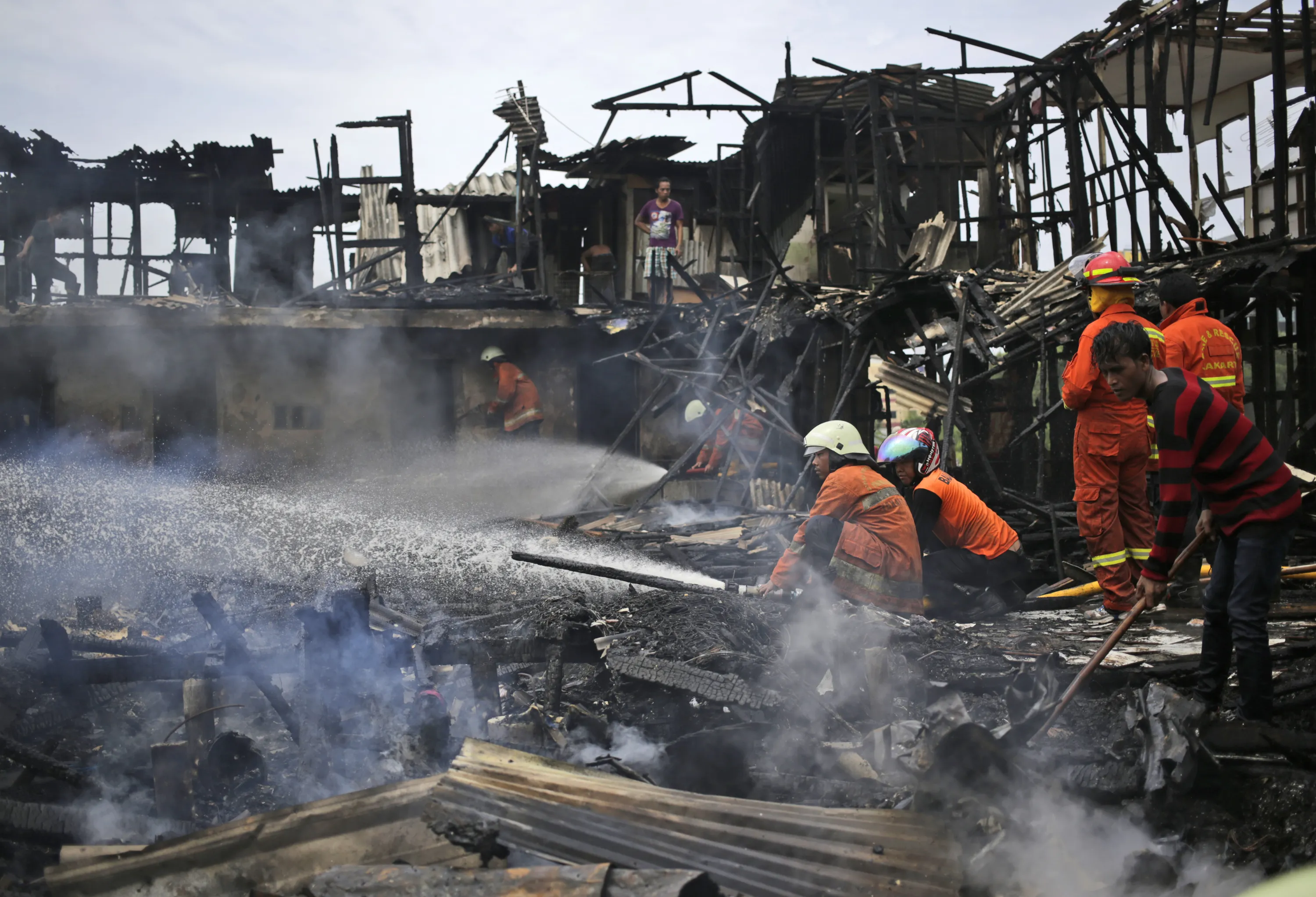Fire fighters spray water to cool down the rubble of houses burned down in a fire that razed through a slum in Jakarta, Indonesia, Tuesday, January 26, 2016. (Photo by Dita Alangkara/AP Photo)