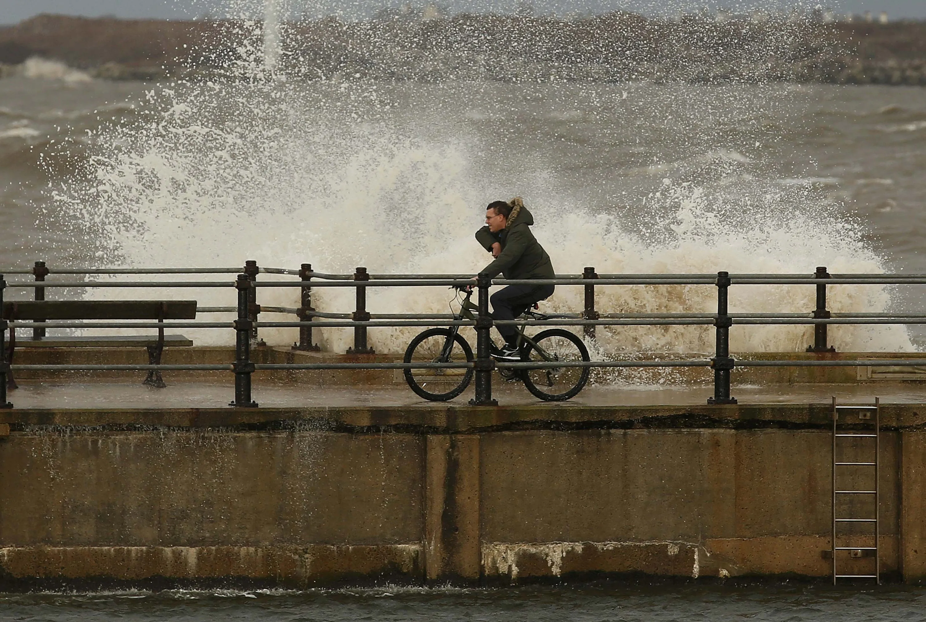 A man rides his bike as waves break over the promenade at New Brighton, near Wallasey in Britain January 26, 2016. (Photo by Phil Noble/Reuters)