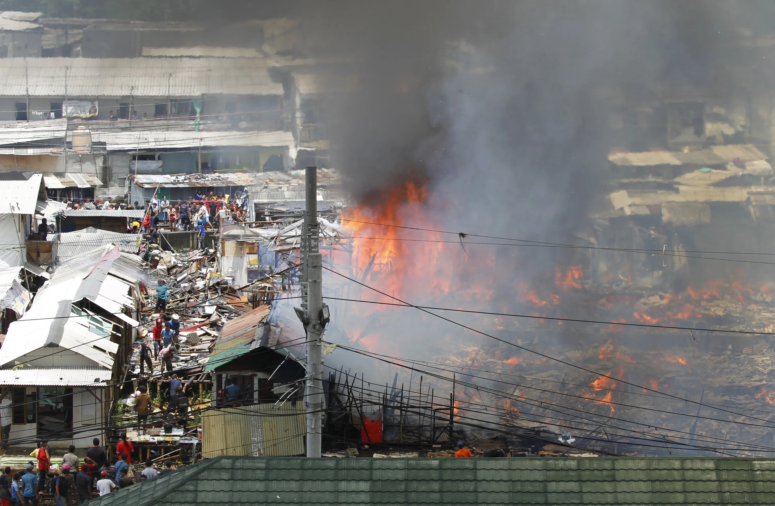 Residents fight a fire in a slum area next to railway tracks in Kampung Bandan, North Jakarta, Indonesia January 26, 2016. According to local media, the fire destroyed approximately 100 wooden dwellings, built along a busy railway line. (Photo by Garry Lotulung/Reuters)