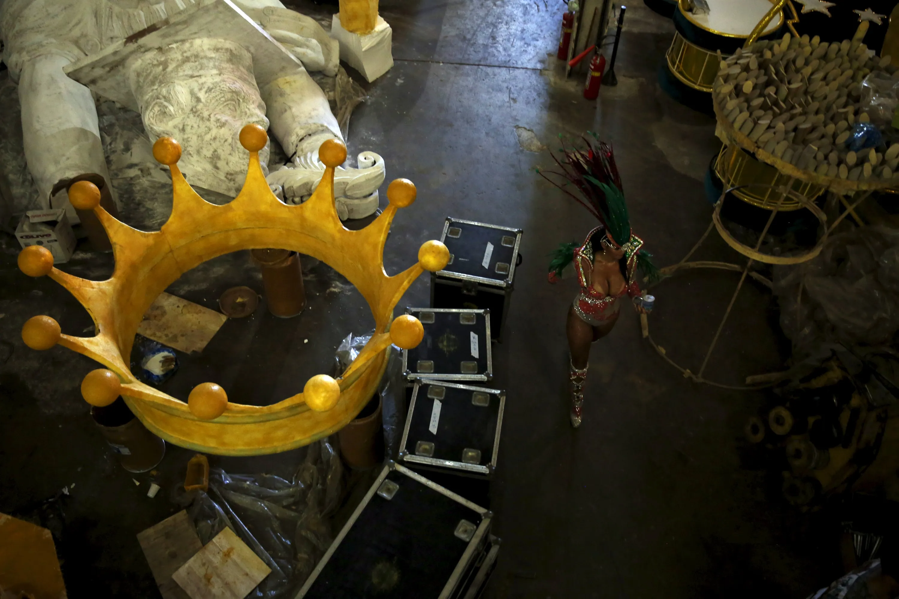 A dancer walks past next to a part of a carnival float at the Grande Rio Samba school in Rio de Janeiro, Brazil, January 26, 2016. The Rio de Janeiro Carnival will be held from February 5 to February 9. (Photo by Pilar Olivares/Reuters)