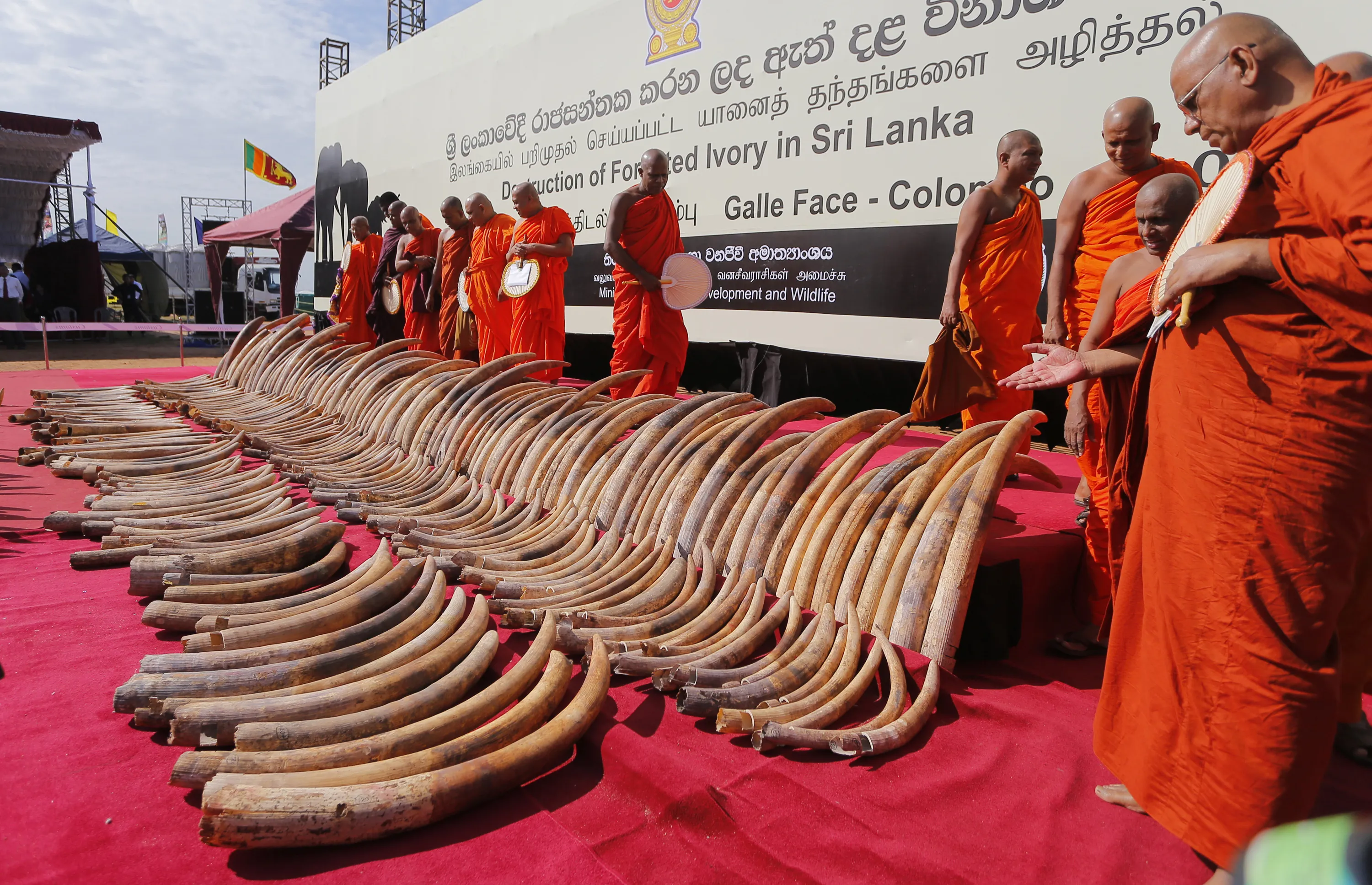 Buddhist monks give the slaughtered elephants blessings for a better rebirth as a shipment of African ivory seized three years ago, is displayed before they are destroyed in Colombo, Sri Lanka, Tuesday, January 26, 2016. The ivory was traced to northern Mozambique and Tanzania and has been valued by Sri Lankan customs at 368 million rupees (more than $2.5 million). The 359 tusks weighing a total of 1,529 kilograms (3,370 pounds) were crushed by machines into smaller pieces that will later be burned to ash in high-temperature ovens at a cement factory. (Photo by Eranga Jayawardena/AP Photo)