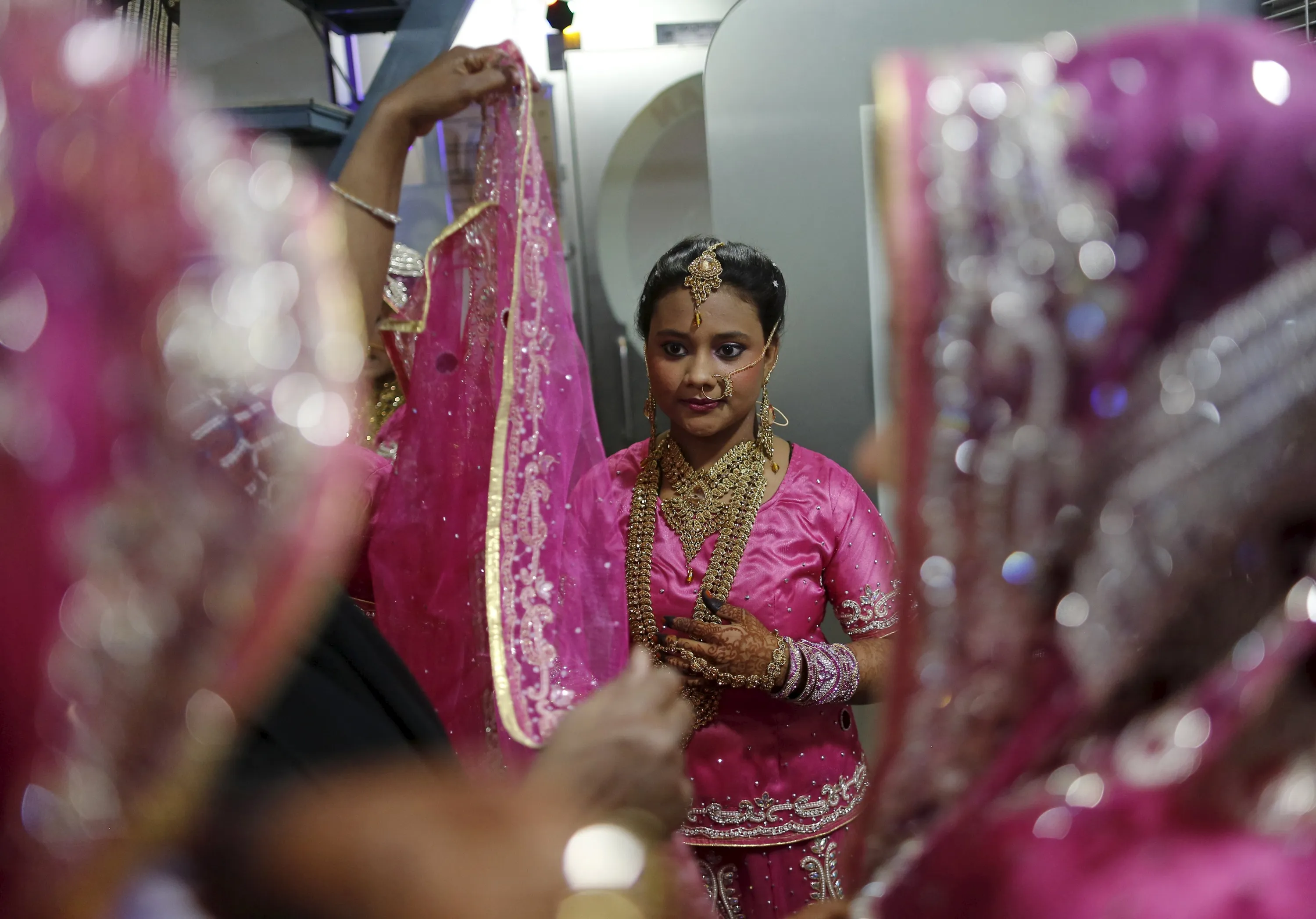 A Muslim bride gets ready as others wait at a beauty parlour before the start of a mass marriage ceremony in Mumbai, India, January 27, 2016. (Photo by Danish Siddiqui/Reuters)