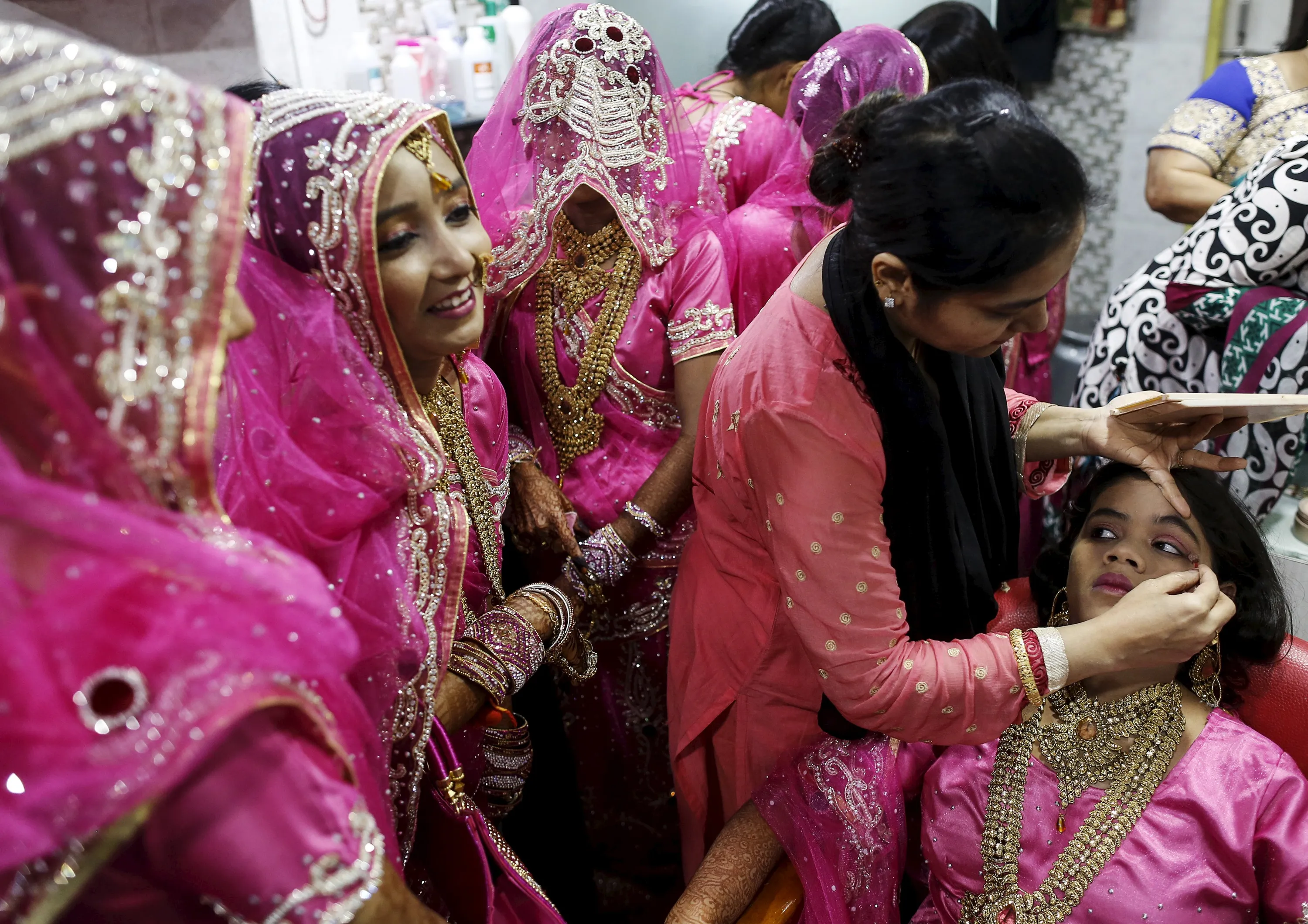 A Muslim bride gets her make-up done as others wait at a beauty parlour before the start of a mass marriage ceremony in Mumbai, India, January 27, 2016. (Photo by Danish Siddiqui/Reuters)