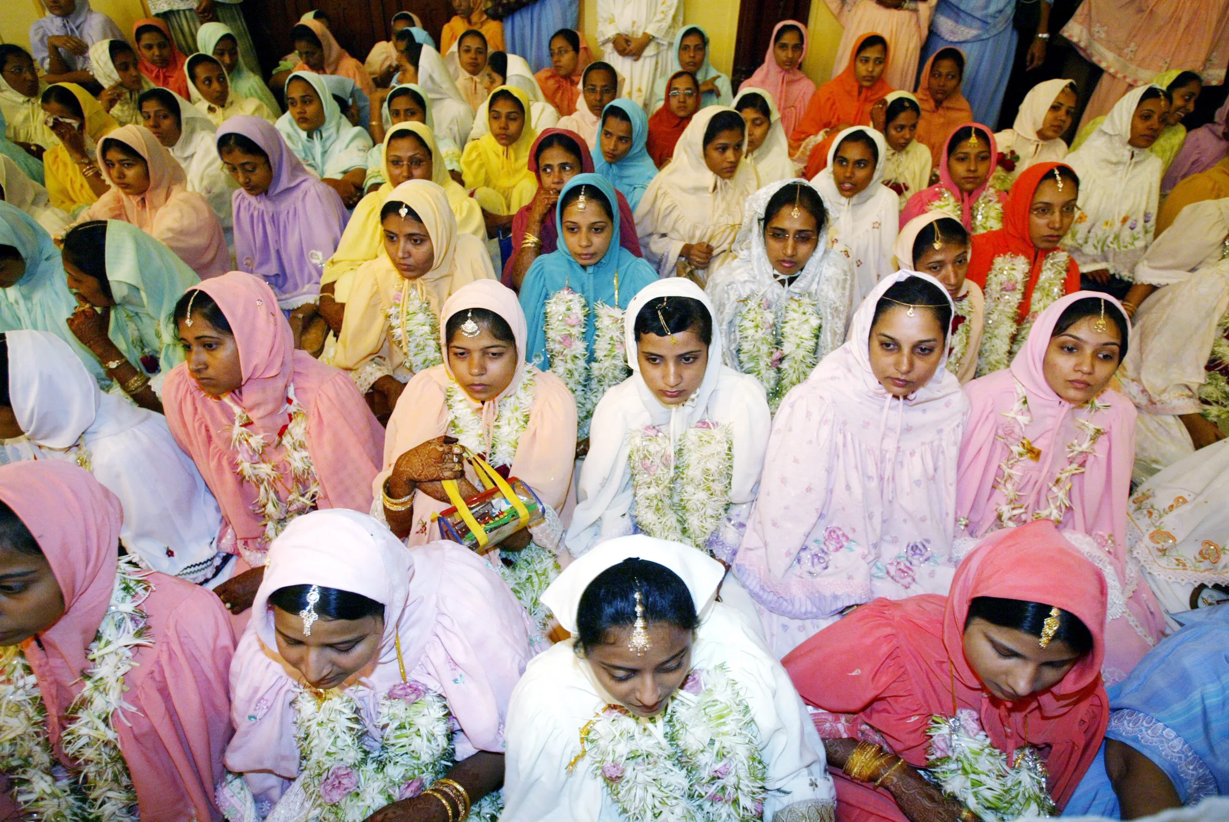 Muslim brides wait during a mass wedding in Mumbai September 18, 2003. (Photo by Sherwin Crasto/Reuters)