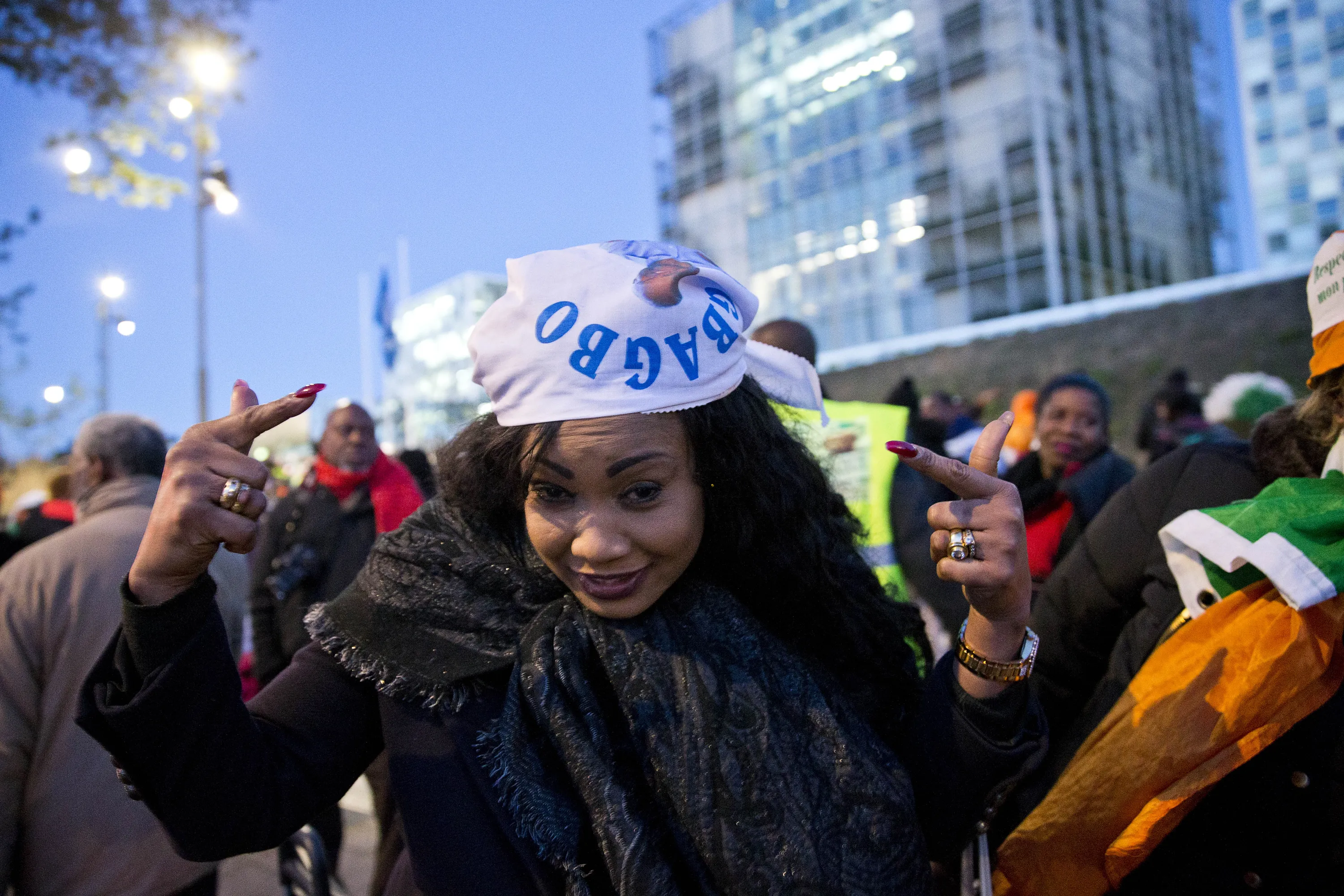 A woman shows her support for Former Ivory Coast president Laurent Gbagbo and former minister Charles Ble Goude as scores rally outside the International Criminal Court, rear, in The Hague, Netherlands, Thursday, January 28, 2016. Gbagbo and Goude stand trial for their alleged involvement in deadly post-election violence. (Photo by Peter Dejong/AP Photo)