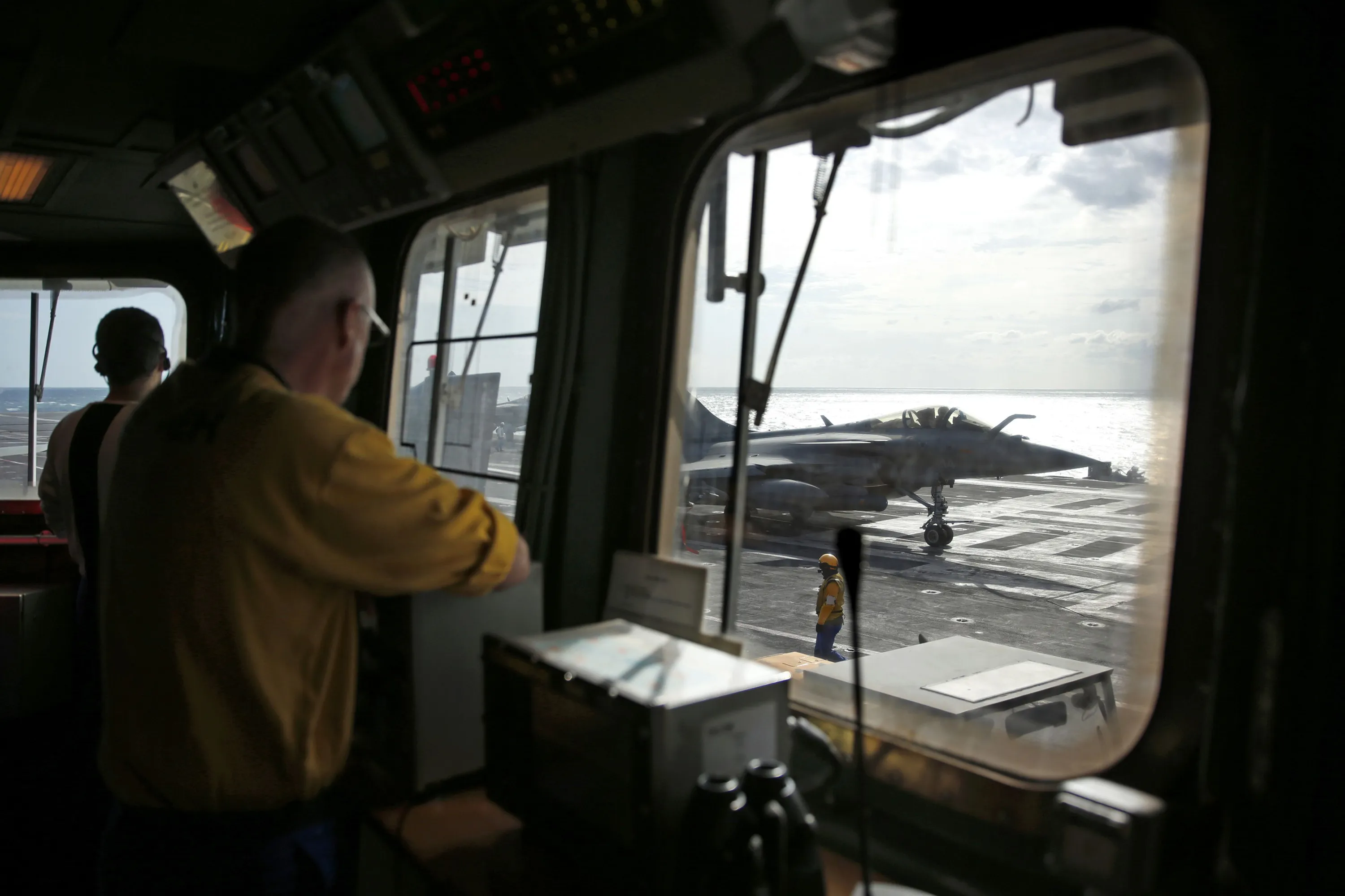 A “yellow dog” flight desk officer watches as a Rafale fighter jet prepares to take off aboard France's Charles de Gaulle aircraft carrier on missiion in the Gulf, January 28, 2016. (Photo by Philippe Wojazer/Reuters)