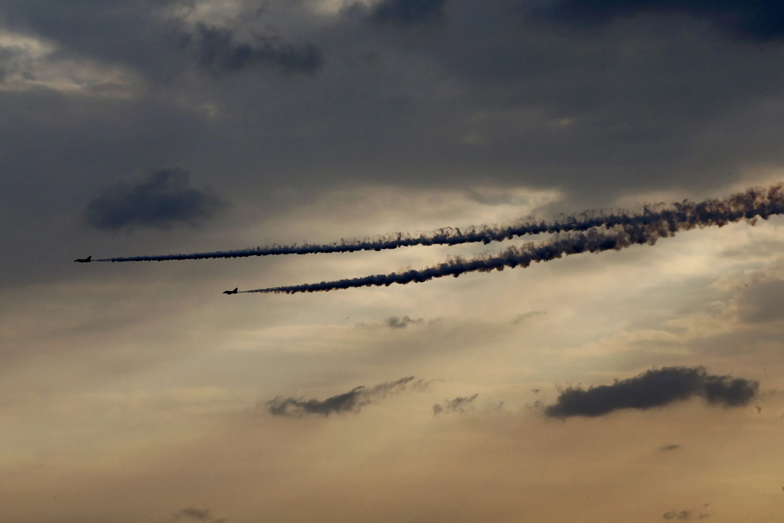 Super Etendard fighter jets dump fuel after a mission, before landing on France's flagship Charles de Gaulle aircraft carrier on mission in the Gulf, January 28, 2016. (Photo by Philippe Wojazer/Reuters)