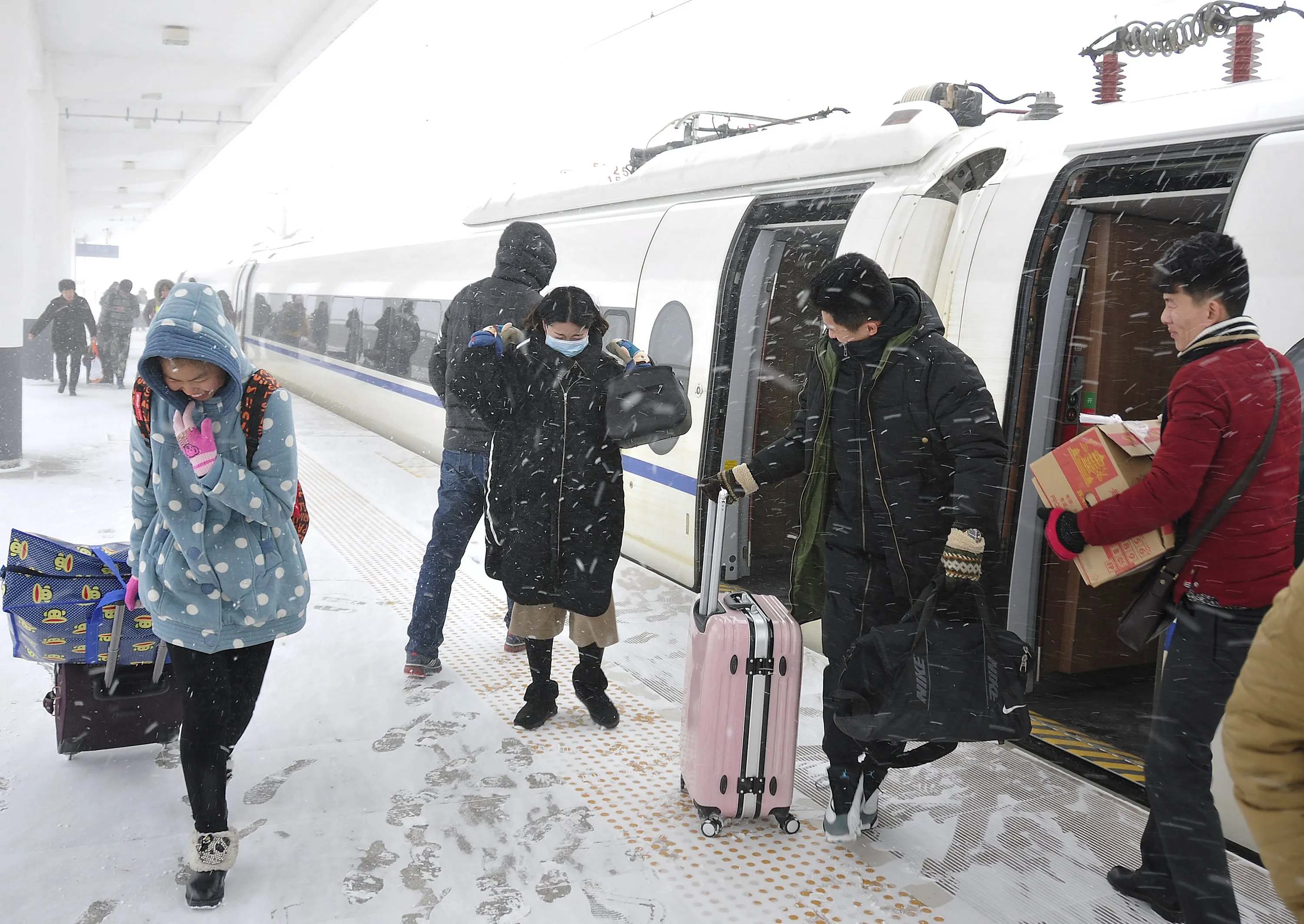 Passengers walk against snow as they get off a train at a railway station in Qingrong, Shandong province, China, January 24, 2016. (Photo by Reuters/China Daily)