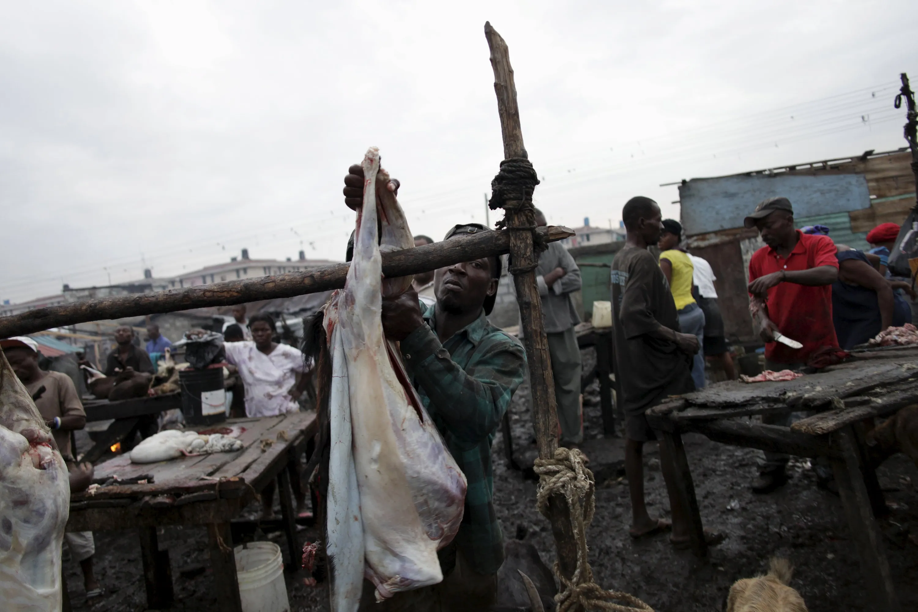 Jean Libonet hangs a butchered goat to be sold at La Saline slaughterhouse in Port-au-Prince, Haiti, March 19, 2015. (Photo by Andres Martinez Casares/Reuters)