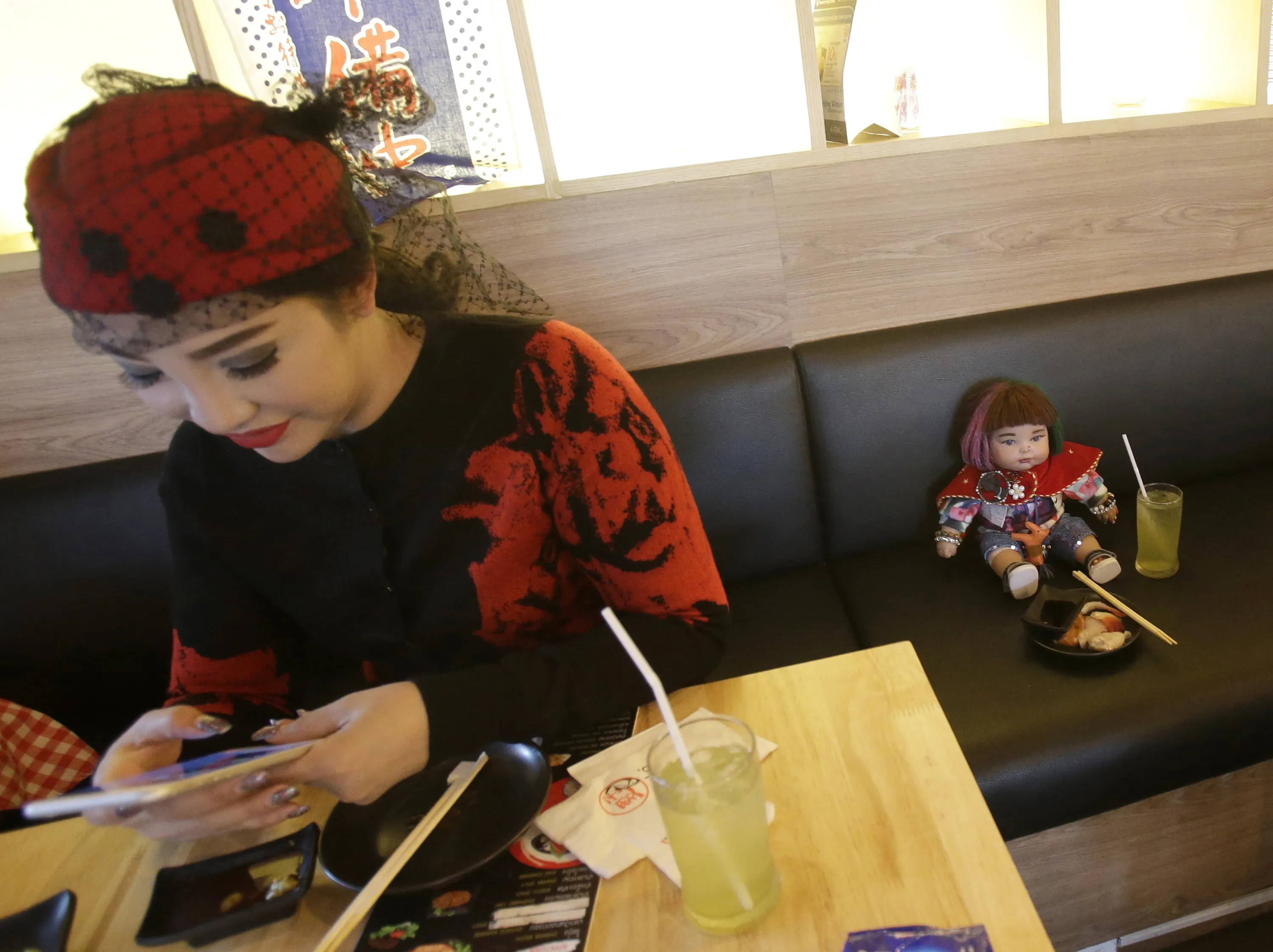 Supavadee Tapmalai uses her smartphone next to a “child angel” doll at a Japanese restaurant in Bangkok, Thailand, Friday, January 28, 2016. (Photo by Sakchai Lalit/AP Photo)