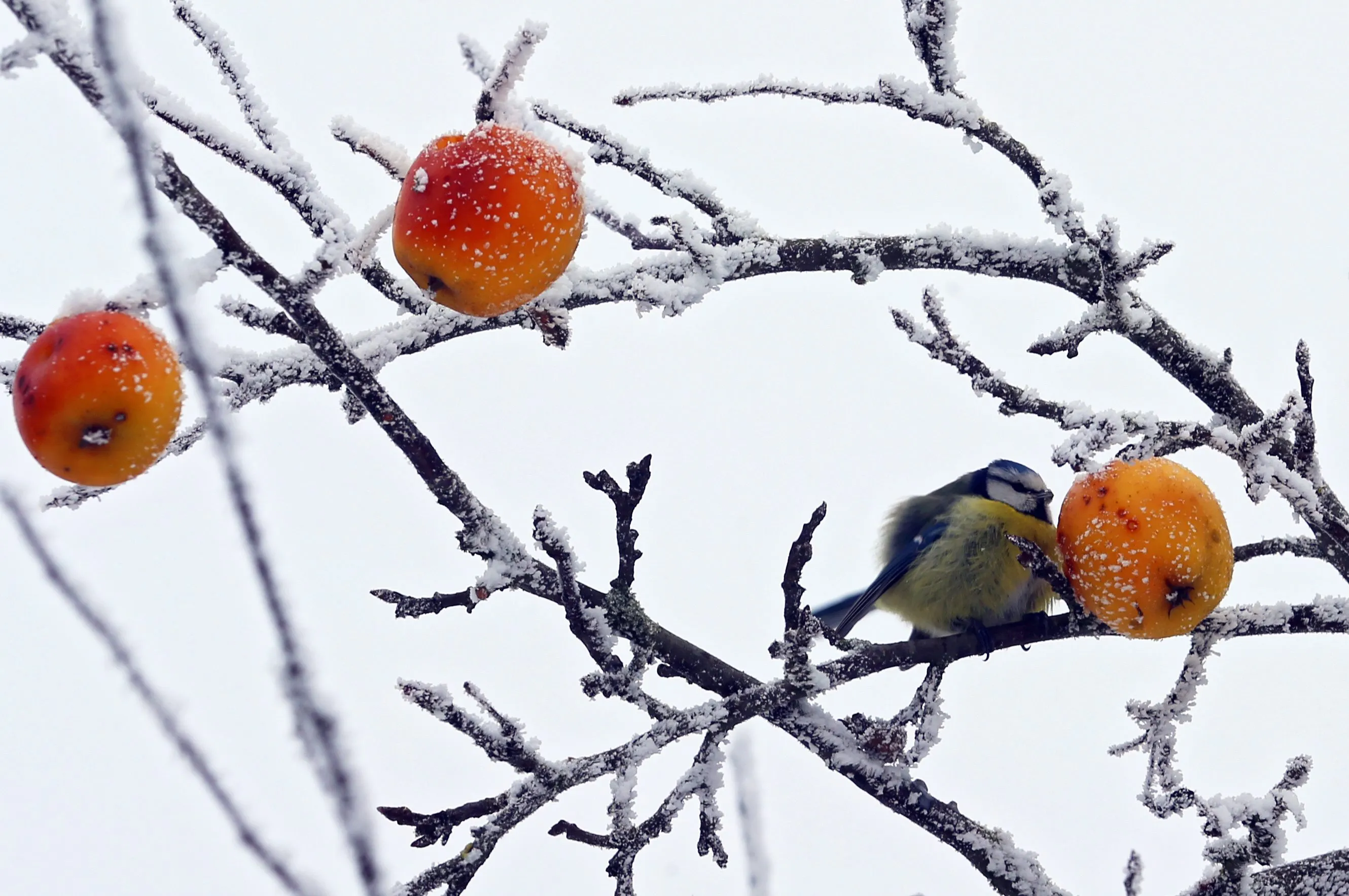 A blue tit bird sitting on a branch and pecking at a frost coated apple on an apple tree in Esselbach, Germany, 22 January 2016. (Photo by Karl-Josef Hildenbrand/EPA)