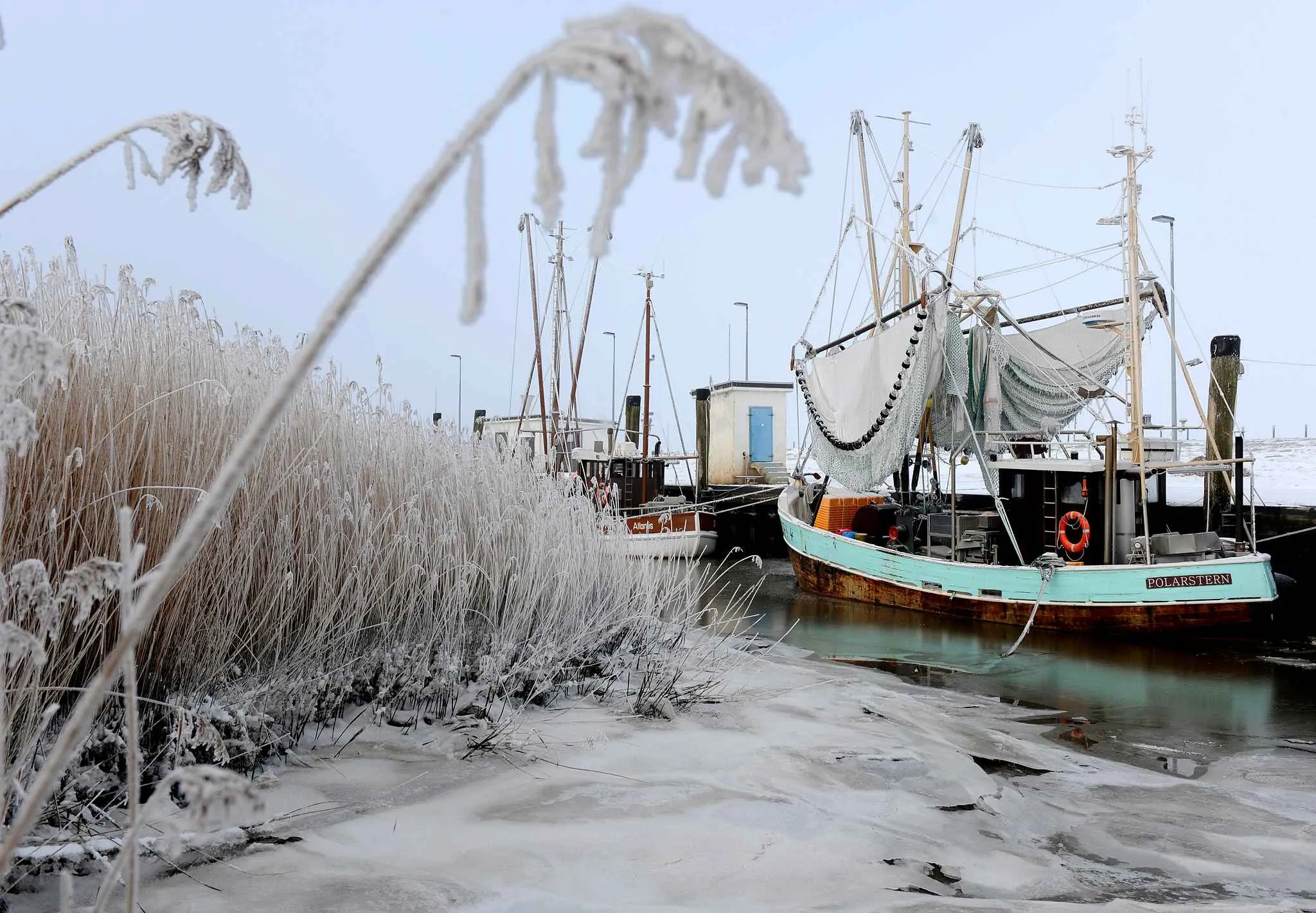 Mooring shrimp boats are seen at the frost-covered North-Sea-port of Spieka, northwestern Germany, on January 21, 2016. (Photo by Ingo Wagner/AFP Photo/DPA)