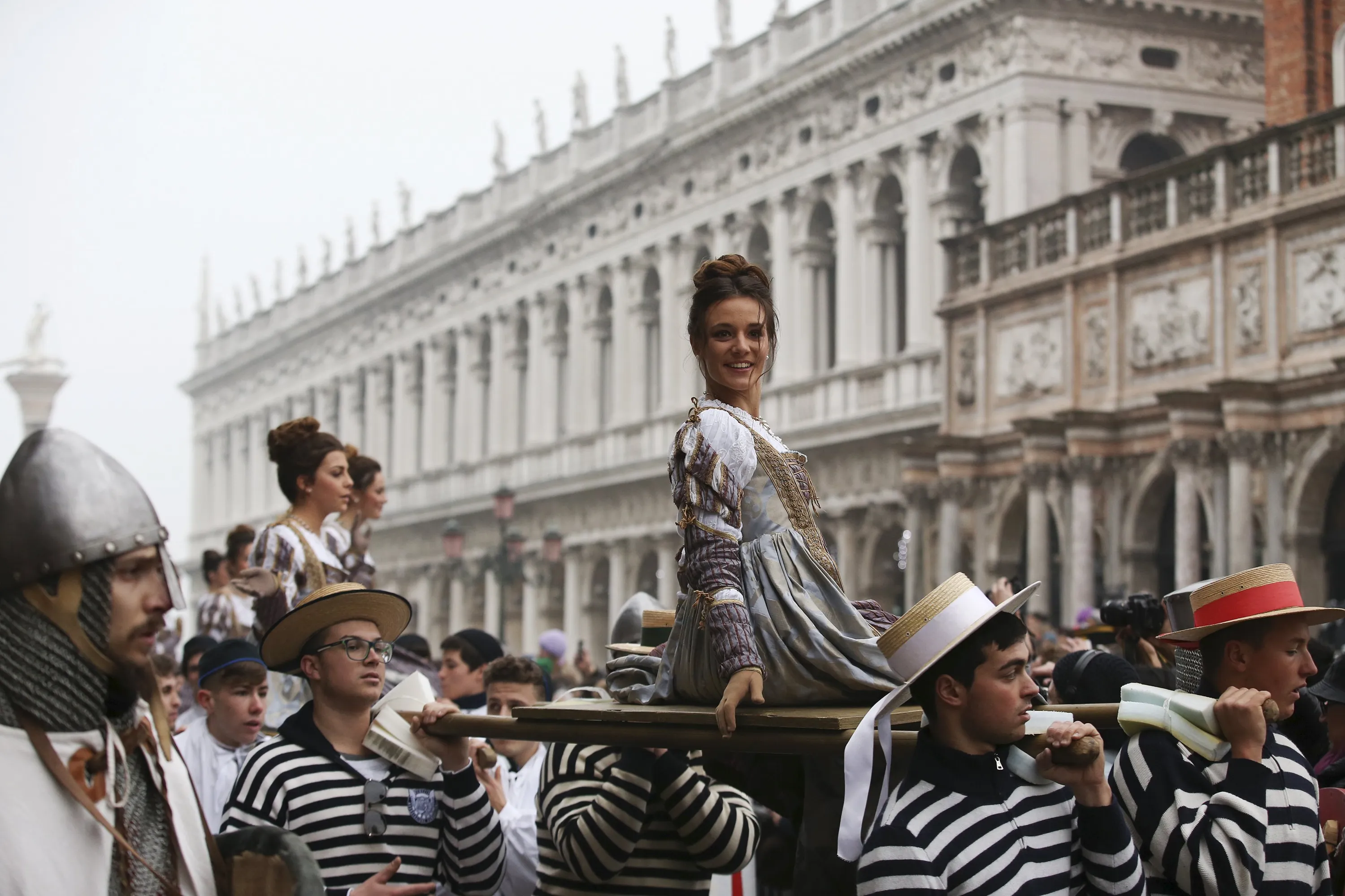 The traditional “Marie”, women wearing historical costumes, are carried during the “Festa delle Marie” procession in San Marco Square during the Venice Carnival January 30, 2016. (Photo by Alessandro Bianchi/Reuters)