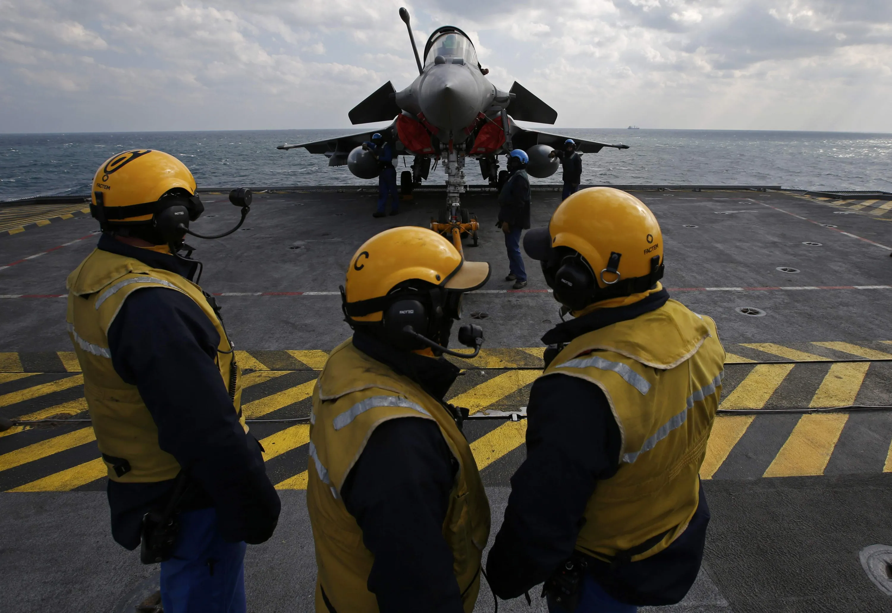 “Yellow dogs” fly deck directors watch as a Rafale fighter jet is brought up on an elevator to the flight deck aboard France's Charles de Gaulle aircraft carrier in the Gulf, January 29, 2016. (Photo by Philippe Wojazer/Reuters)