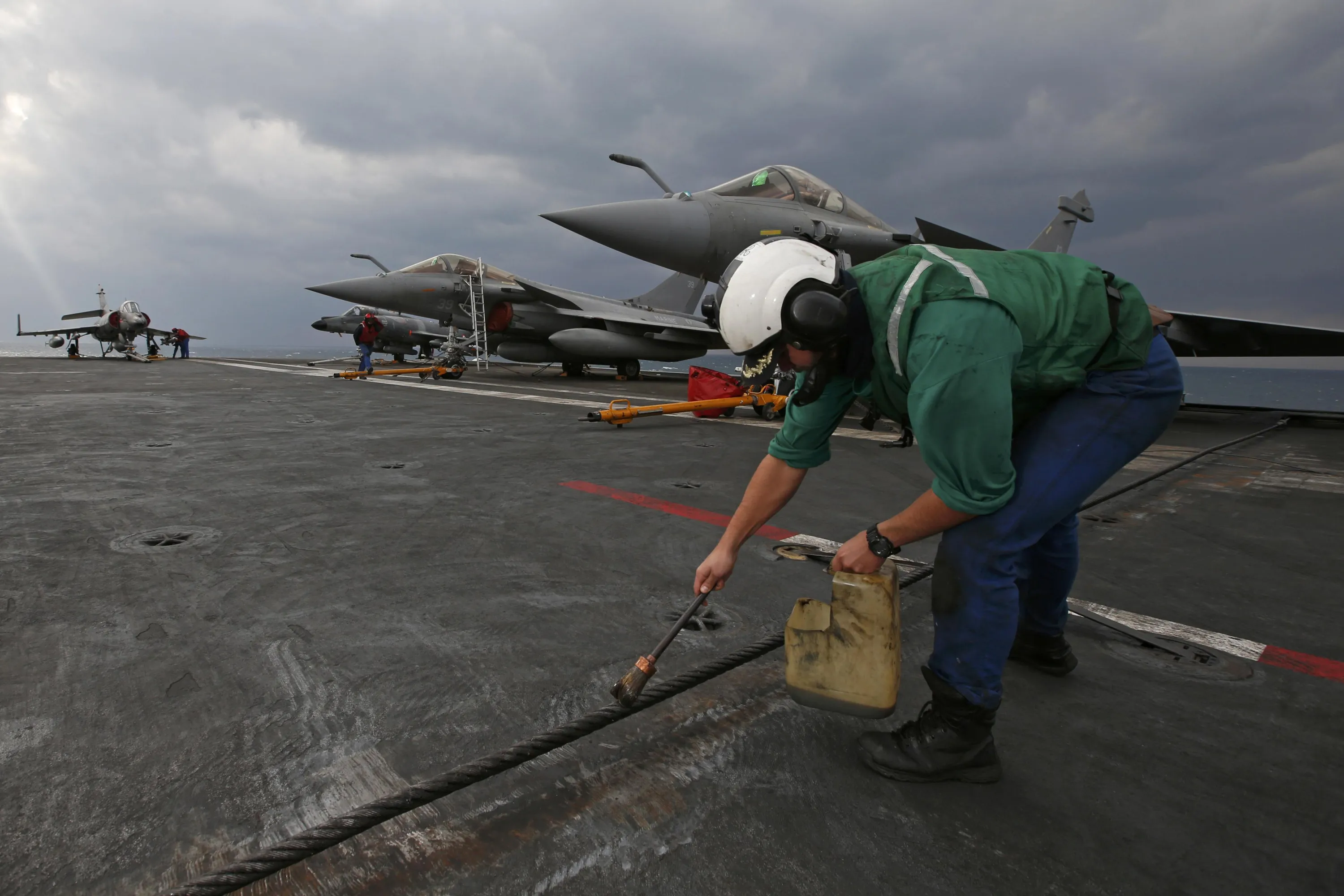 A crew member greases one of the three arresting cables used to stop fighter jets when they land on the flight deck aboard France's Charles de Gaulle aircraft carrier in the Gulf, January 29, 2016. (Photo by Philippe Wojazer/Reuters)