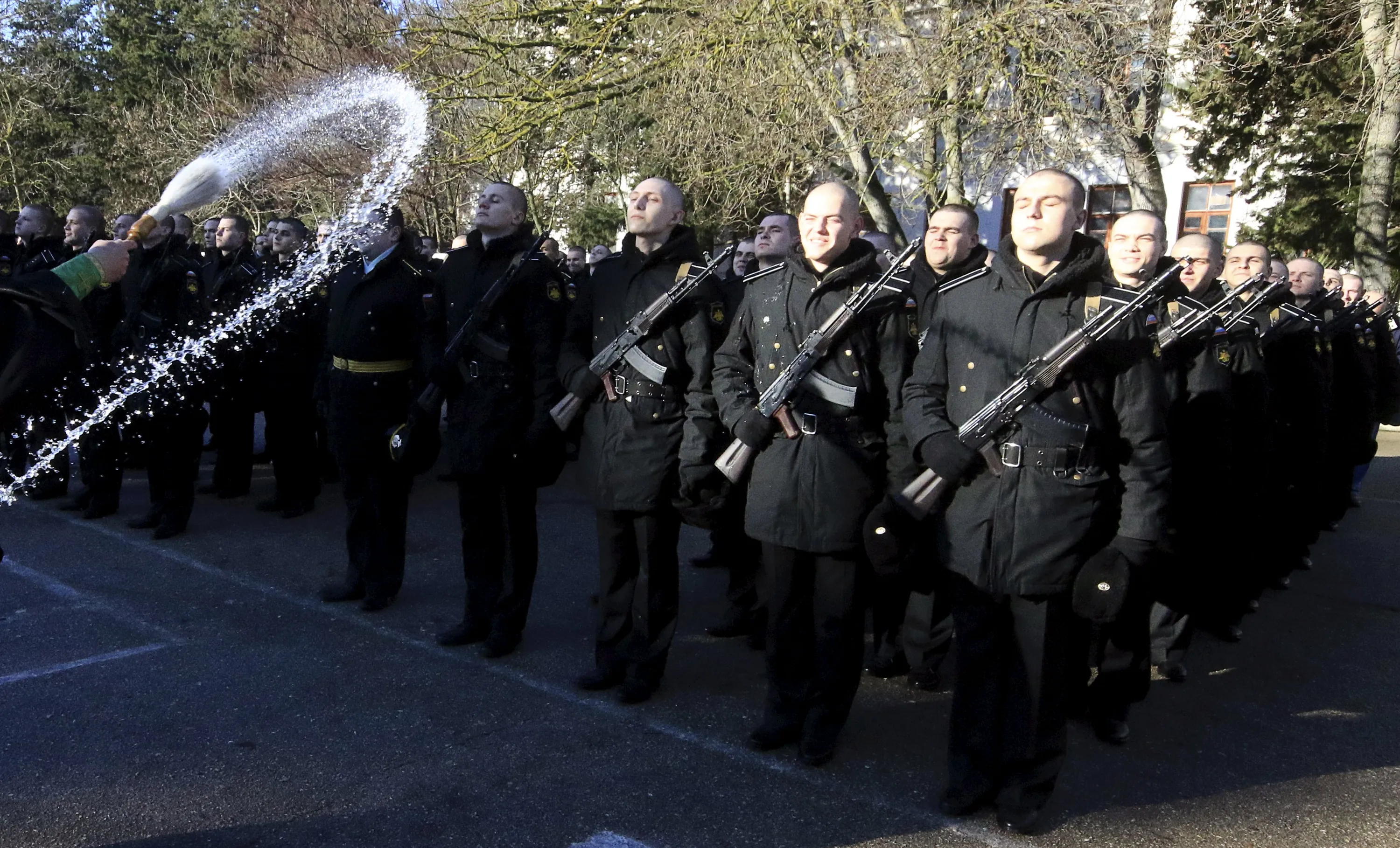 An Orthodox priest sprinkles water to bless servicemen swearing the oath during a ceremony at a training centre of the Russian Navy in Sevastopol, Crimea, January 30, 2016. (Photo by Pavel Rebrov/Reuters)
