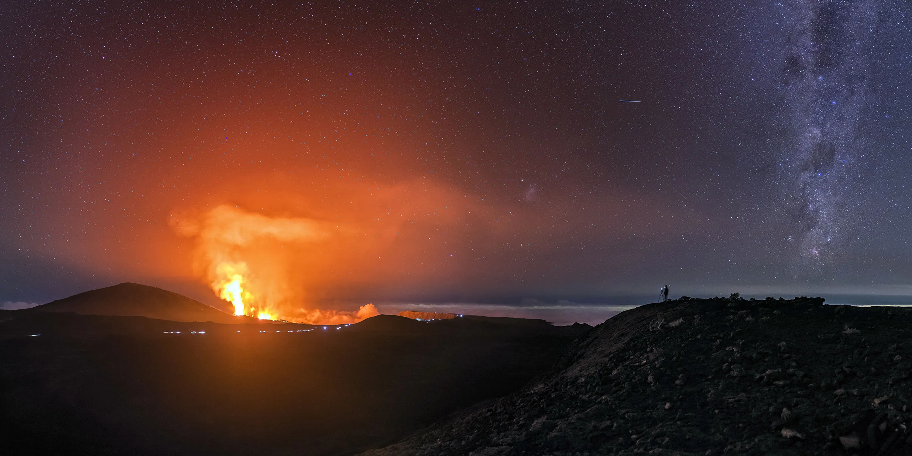 The photos were taken at the Piton de la Fournaise volcano on Reunion Island, a French island in the Indian Ocean one of the most active volcanoes in the world. Here: Luc Perrot taking pictures of the erupting volcano. (Photo by Luc Perrot/Caters News)