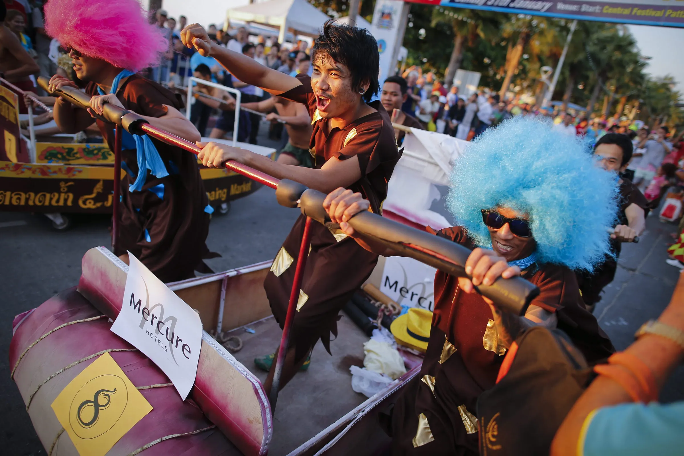 Participants run with their customized beds during the Pattaya Bed Race 2016, in Pattaya, Thailand, 31 January 2016. The annual festival, now in its eighth edition, saw teams from business in Pattaya taking part in the race, whilst proceeds from entry fees paid by bars, hotels and other businesses joining the race will go to a local charity caring for orphans. (Photo by Diego Azubel/EPA)