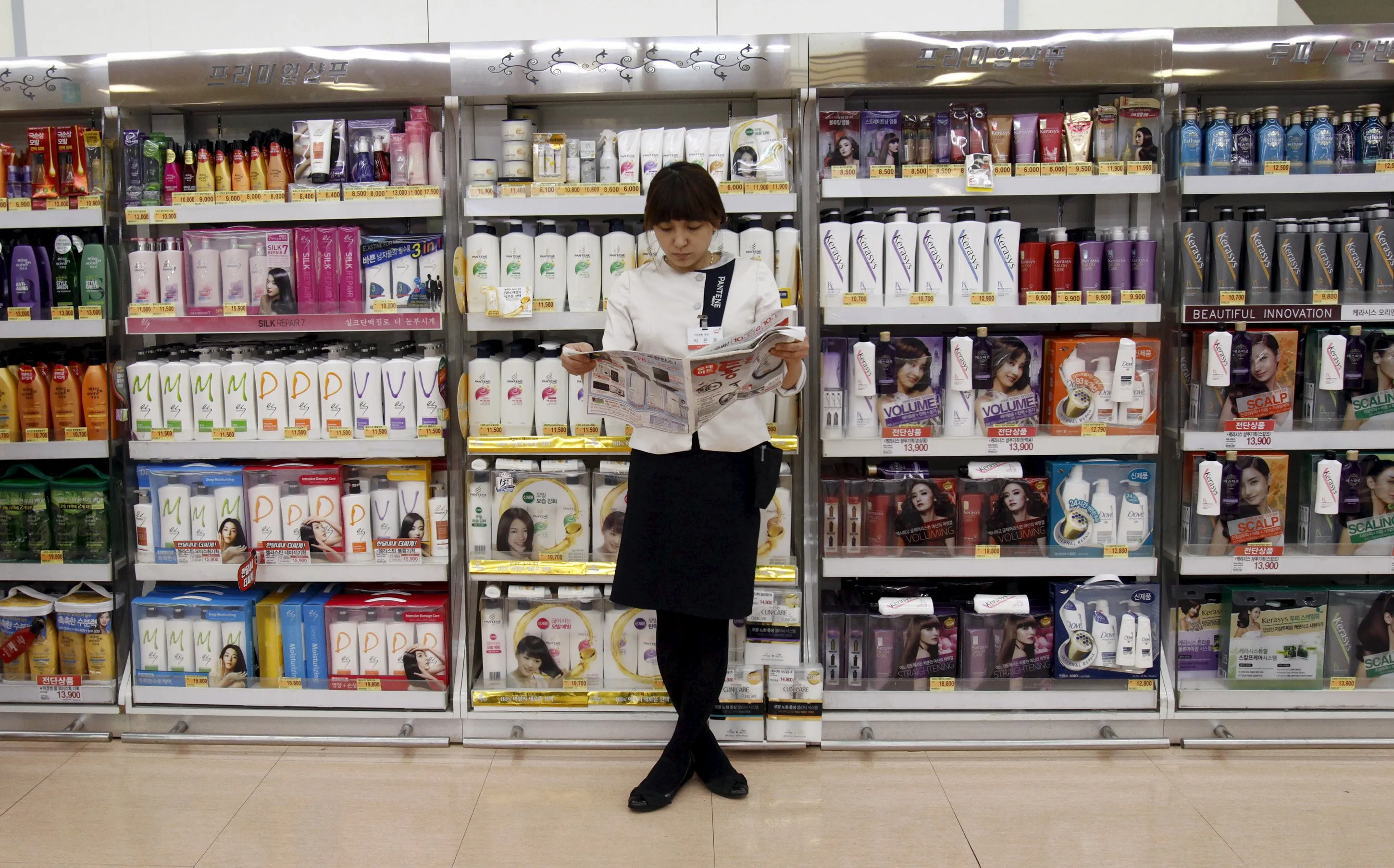 A saleswoman looks at a newspaper as she waits for customers in front of hair products at a supermarket in Seoul in this April 27, 2011 file photo. South Korea is expected to report inflation figures this week. (Photo by Truth Leem/Reuters)