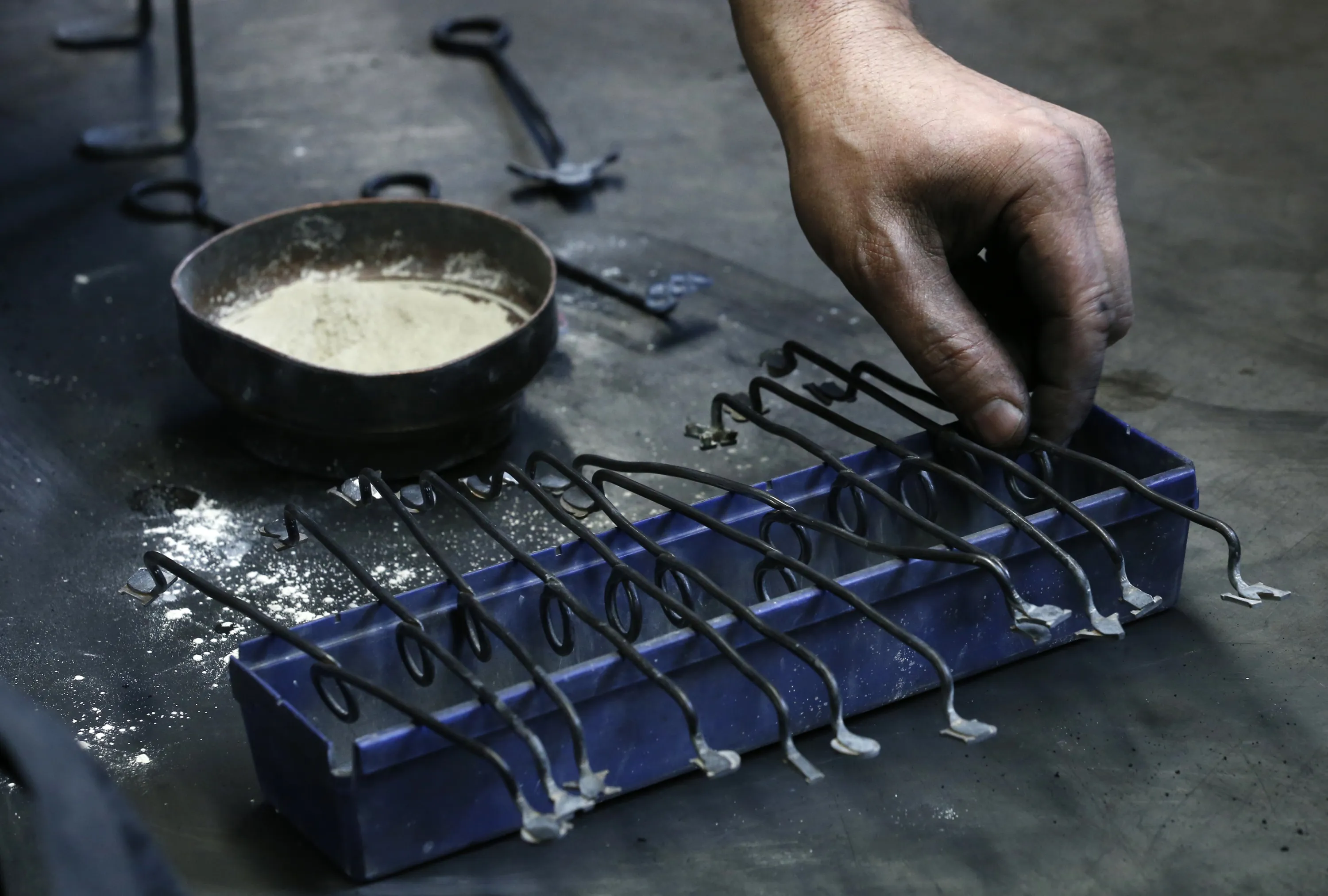 Serge Huguenin of the Blondeau foundry takes a lettering tool during the preparation of a mould for a bell in La Chaux-de-Fonds, Switzerland January 19, 2016. (Photo by Denis Balibouse/Reuters)