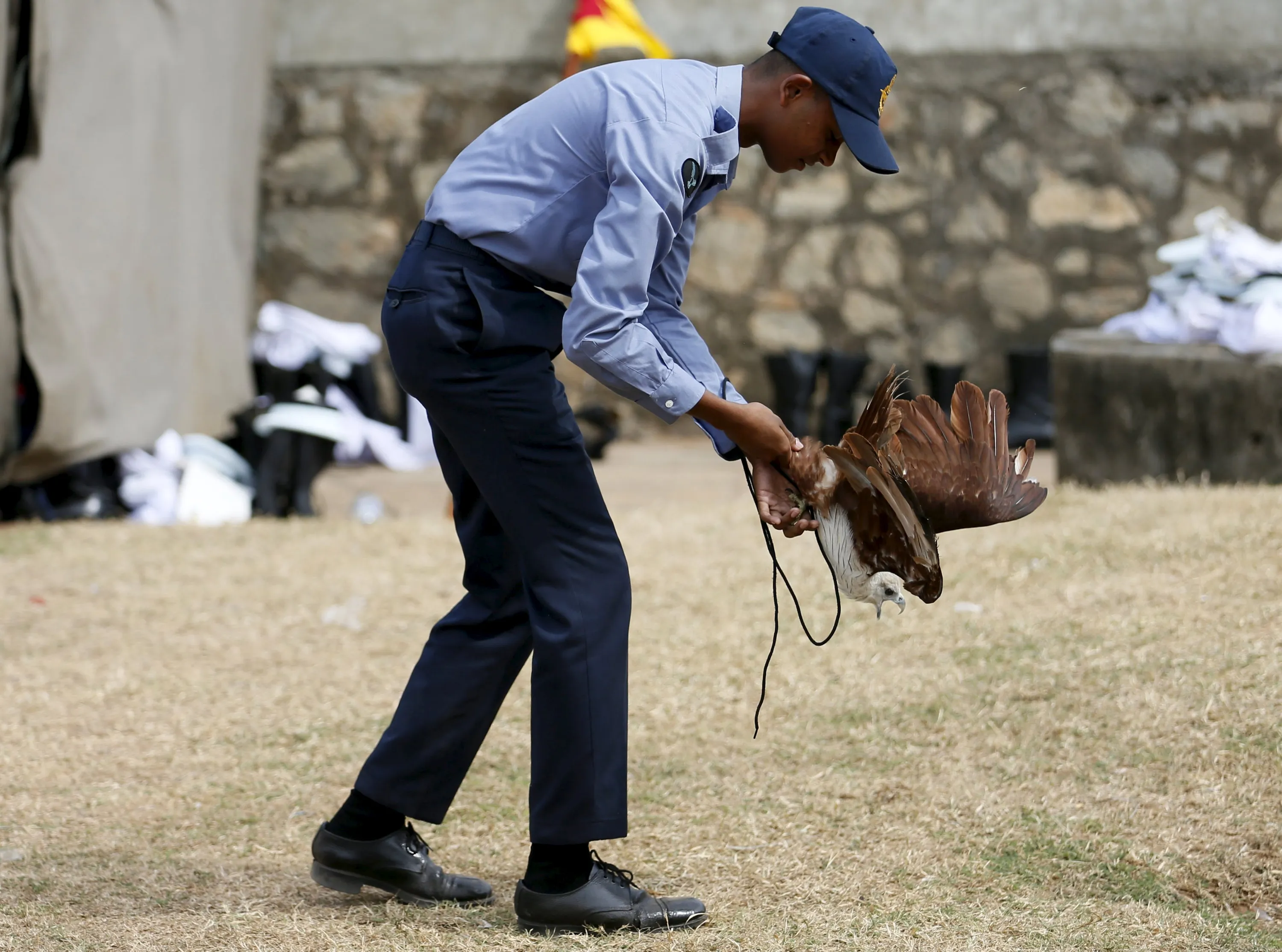 An eagle, the symbol of Sri Lanka's Air Force tries to fly away while a soldier attempts to control it during a rehearsal for Sri Lanka's 68th Independence day celebrations in Colombo, February 2, 2016. (Photo by Dinuka Liyanawatte/Reuters)