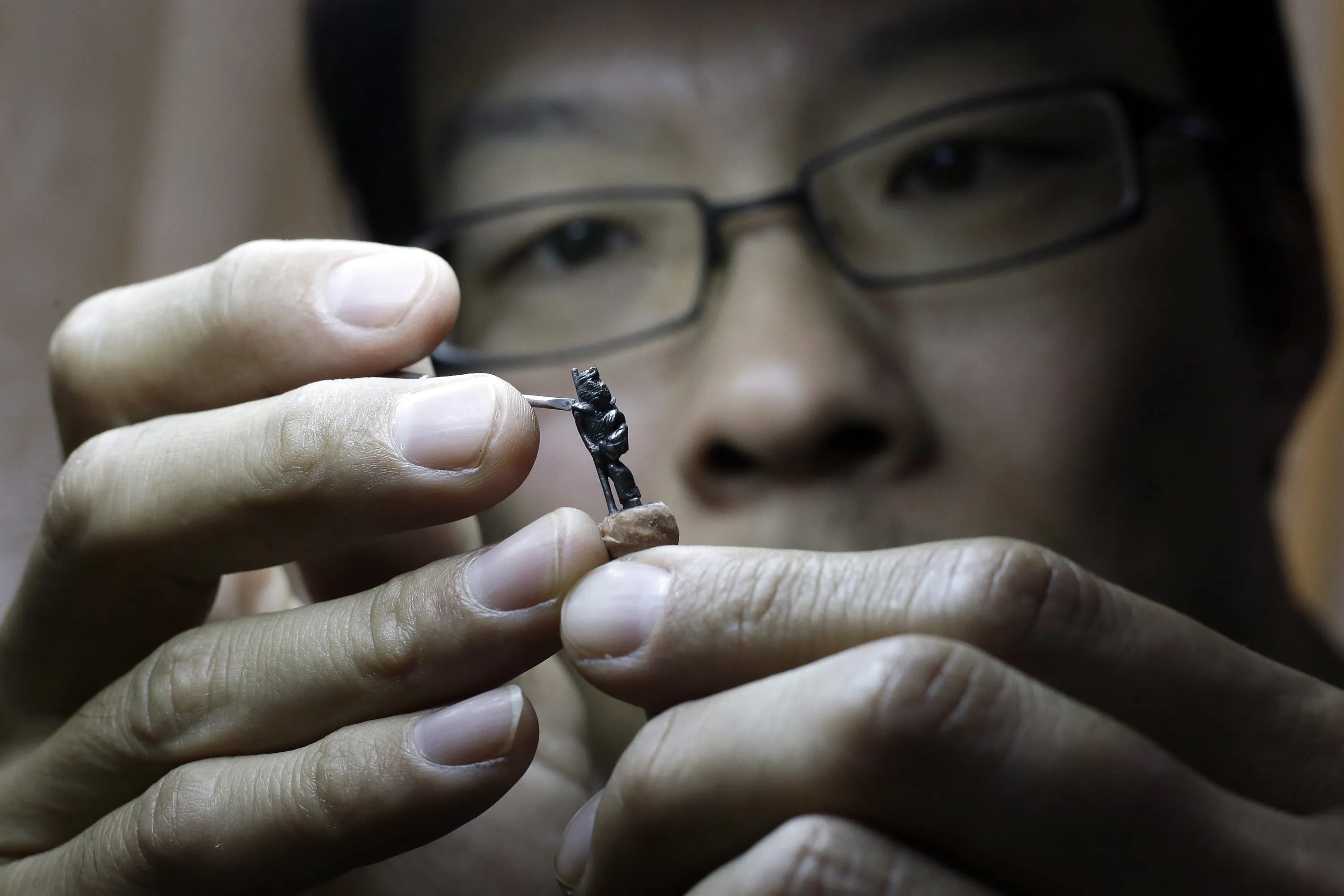 A picture made available on 02 February 2016 shows Taiwanese artist Chien-chu Lee, carving a “Monkey King” from the tip of a pencil lead to mark the Chinese Lunar New Year celebrations, in Yunlin County, Taiwan, 31 January 2016. The Chinese Lunar New Year, or Spring Festival, which falls on 08 February this year, will mark the Year of the Monkey. Lee is an engineer who spends his spare time carving pencil leads as a hobby. “It began about five years ago. I was carving bamboo chopsticks for my children, when a friend suggested me to carve on pencil lead. So I began, and then I became addicted to it. I first carved Chinese weapons and then tried more complicated subjects”, Lee said. (Photo by Ritchie B. Tongo/EPA)