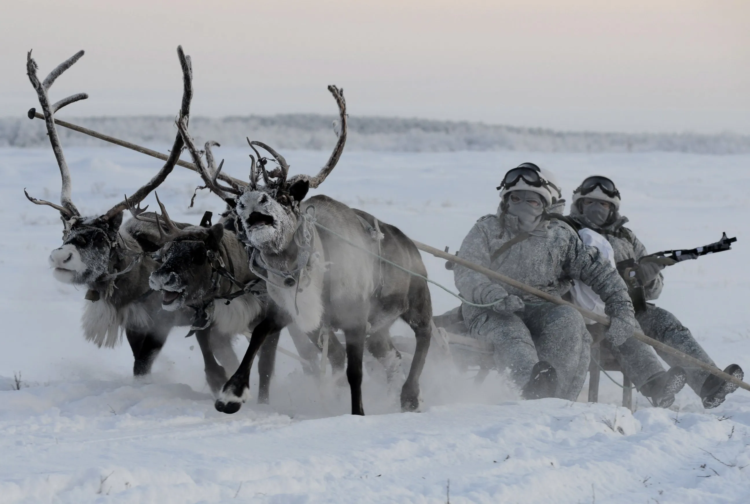Reconnaissance unit members of the Northern Fleet's Arctic mechanized infantry brigade conduct military exercises to learn how to ride a reindeer sled at the reindeer farm near the Lovozero settlement, Russia. (Photo by Lev Fedoseyev/TASS via Getty Images)
