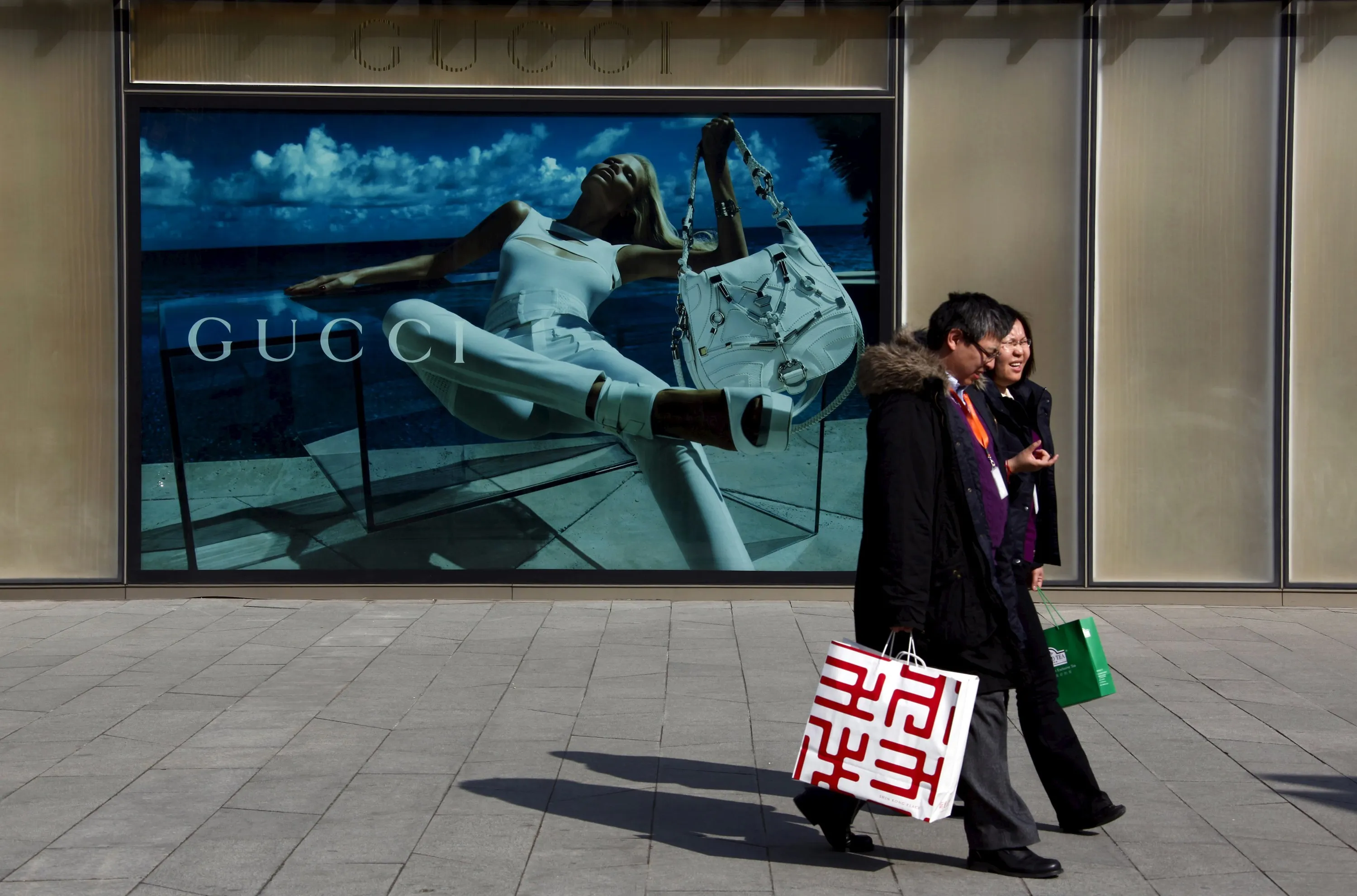 Shoppers walk past a billboard for fashion label Gucci in central Beijing in this December 7, 2010 file photo. More potential bad news for the global economic outlook: Chinese shoppers, who largely propped up growth last year, are likely to trim spending this year; dining out less often, delaying smartphone upgrades and cutting out impulse buys. (Photo by David Gray/Reuters)