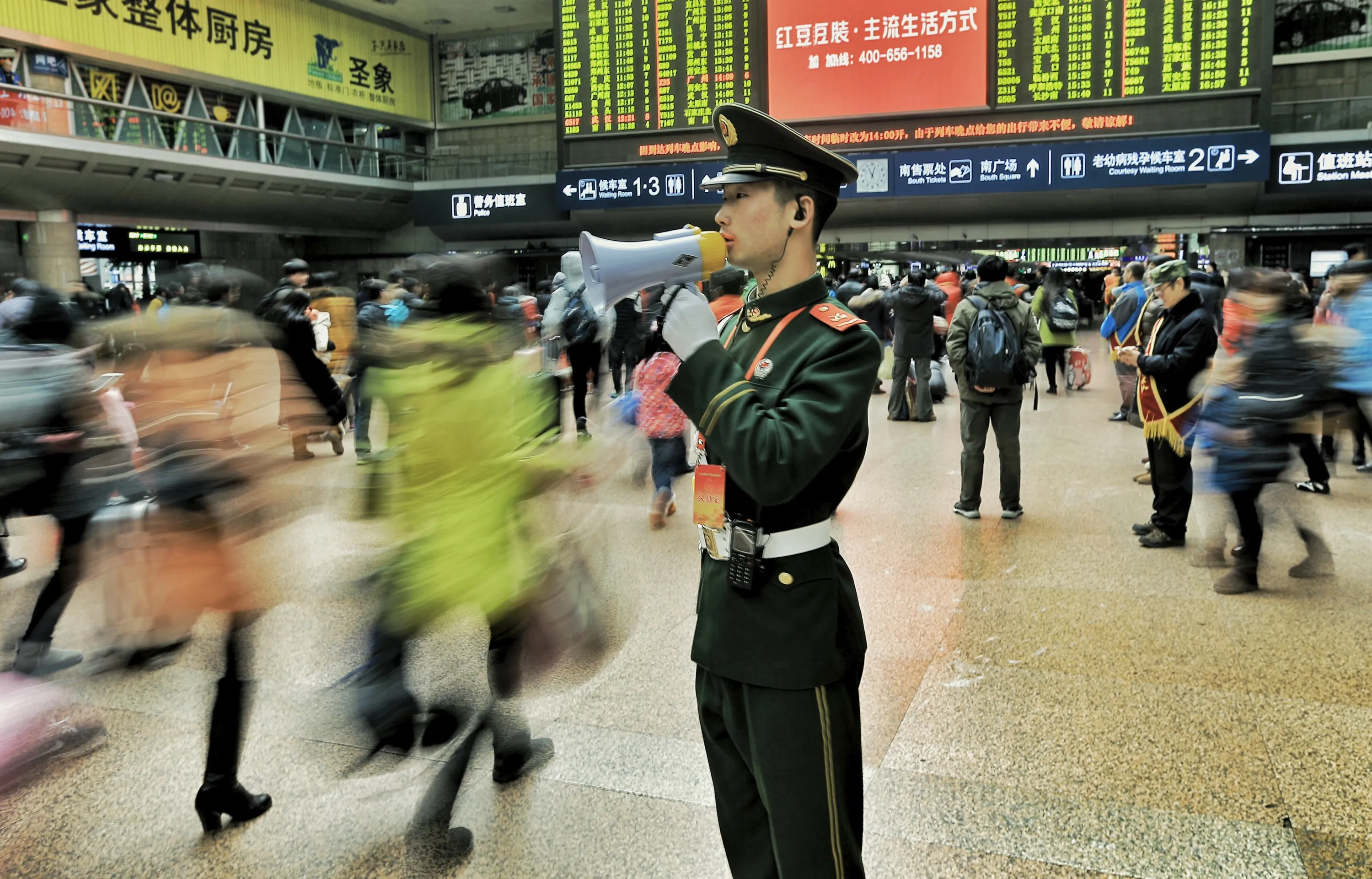 A paramilitary policeman directs passengers at a railway station in Beijing, China, January 30, 2016. According to traffic police, over 2.9 billion trips will be made around China during the 40-day Spring Festival travel rush, which started on January 24. (Photo by Reuters/Stringer)