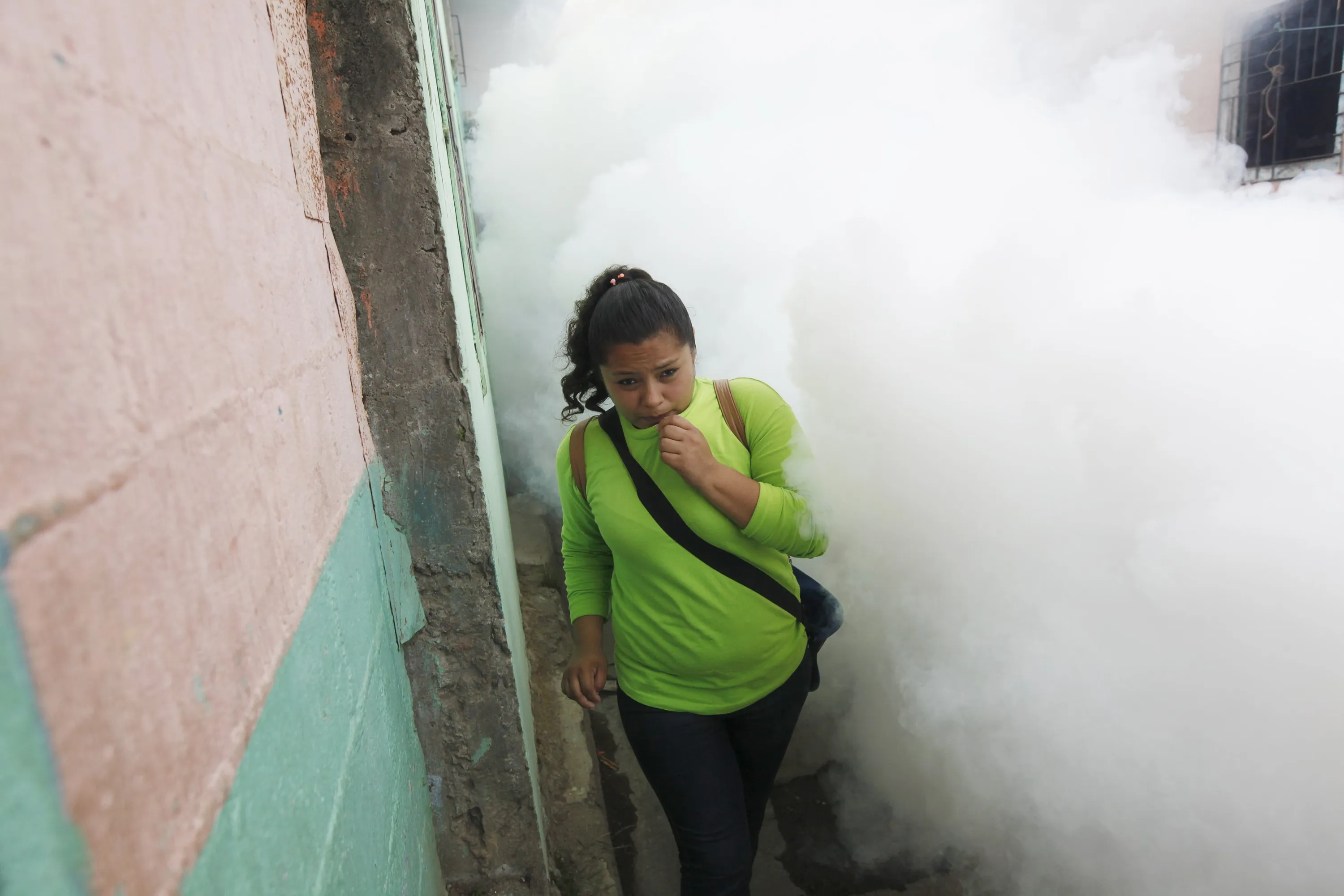A woman protects herself from fog as city health workers fumigate the Guadalupe community as part of preventive measures against the Zika virus and other mosquito-borne diseases in Santa Tecla, El Salvador February 3, 2016. (Photo by Jose Cabezas/Reuters)