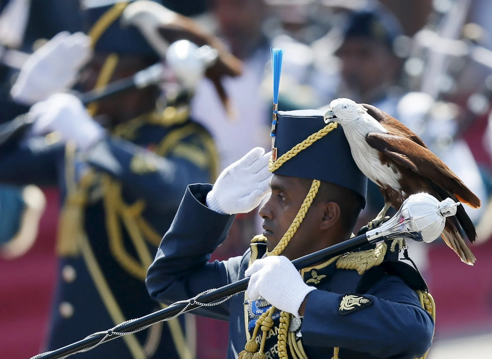 An Air Force soldier marches with an eagle wearing a falconry hood on his shoulder, the symbol of Sri Lanka's Air Force, during Sri Lanka's 68th Independence day celebrations in Colombo, February 4, 2016. (Photo by Dinuka Liyanawatte/Reuters)
