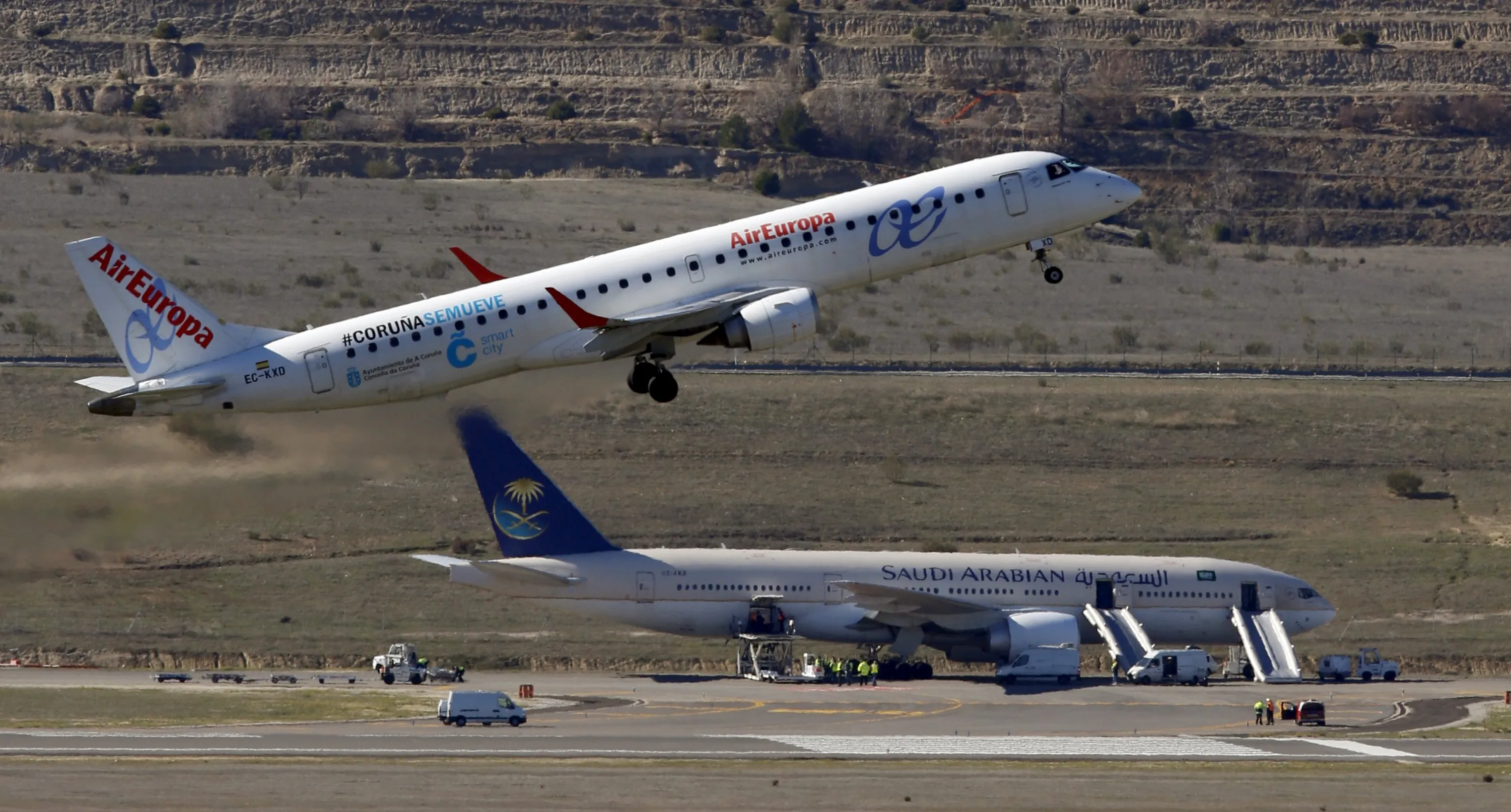 An Air Europa plane flies past Saudi Arabian Airlines flight SVA 226 after its passengers and crew were evacuated following a bomb threat, at the Barajas airport in Madrid, Spain, February 4, 2016. (Photo by Sergio Perez/Reuters)