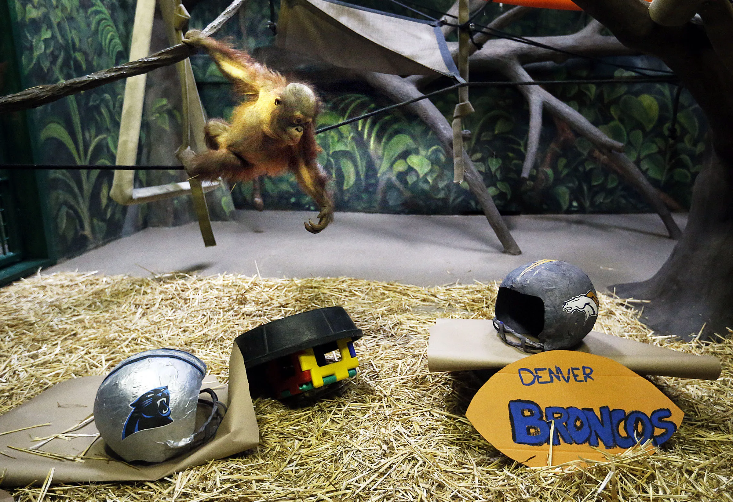 Tuah, an orangutan at Hogle Zoo looks at helmets in his enclosure in Salt Lake City, Thursday, February 4, 2016, after selecting the Carolina Panthers to win the Super Bowl over the Denver Broncos. (Photo by Ravell Call /The Deseret News via AP Photo)